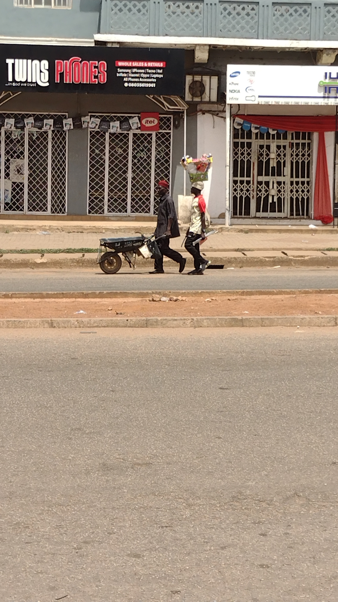 The image is a daytime outdoor scene apparently showing a street in Jos, Nigeria. On the left side of the frame is the storefront of a shop called "TWINS PHONES," with a sign advertising the sale of v…read more