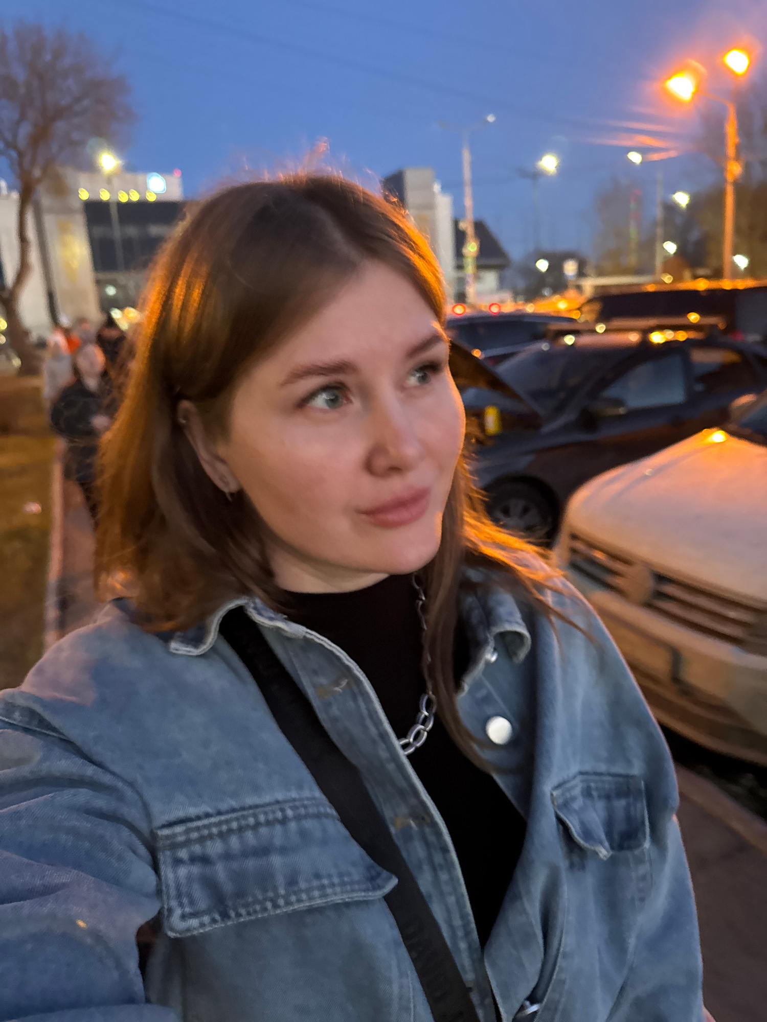 The image depicts a young woman in a denim jacket, standing outdoors at dusk in what appears to be an urban setting. The woman has fair skin, brown hair, and light-colored eyes. She is wearing a blac…read more