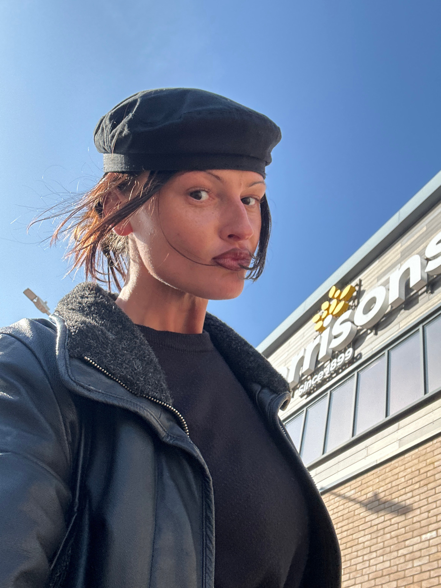 A woman wearing a black beret and black leather jacket poses with her tongue sticking out, likely taking a selfie. She appears to be standing outside a store, as indicated by the sign "Currys" with th…read more