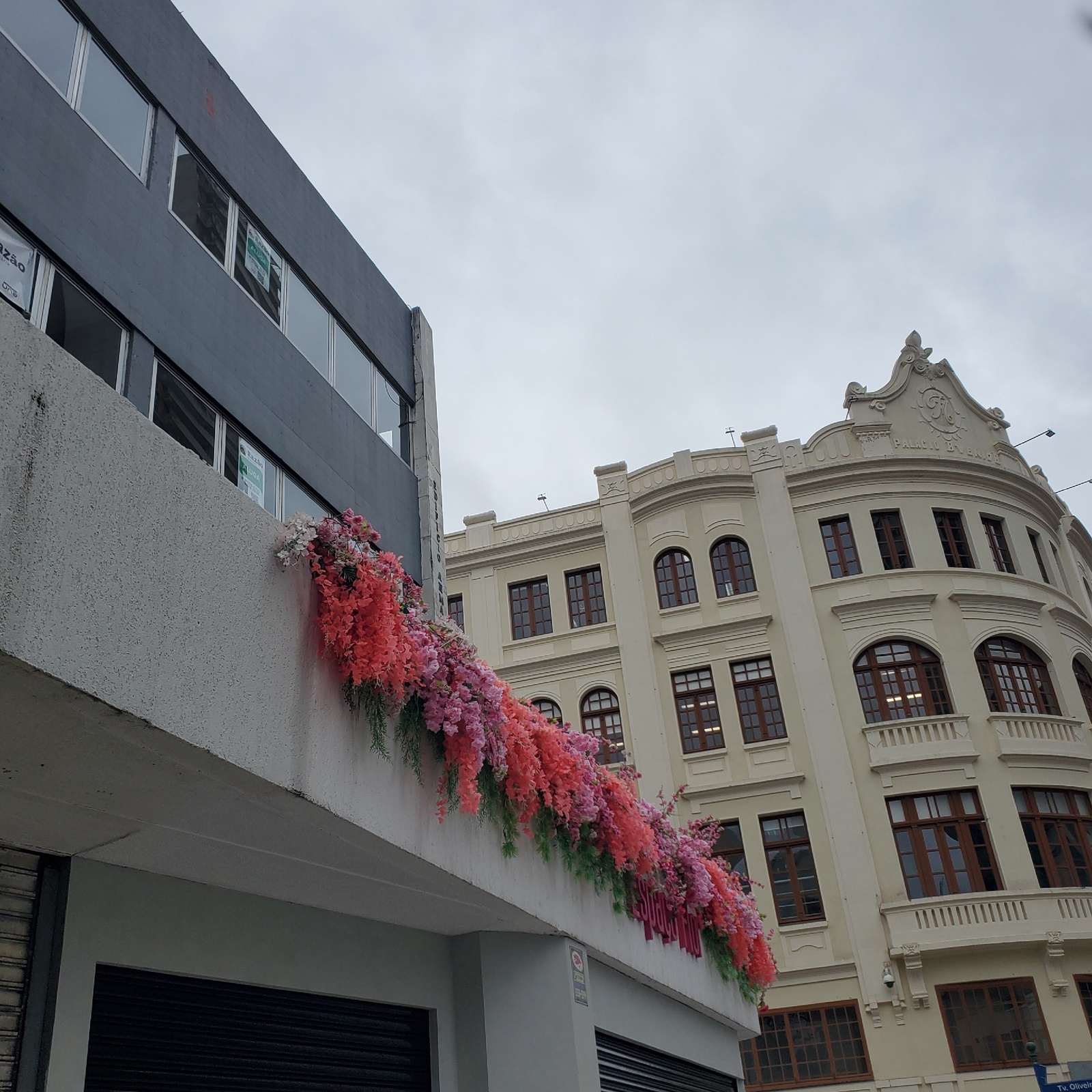 The image shows the facade of two buildings in Curitiba, Brazil, decorated with a cascade of artificial flowers. The building at the top is an older, ornate building with arched windows and a beige fa…read more