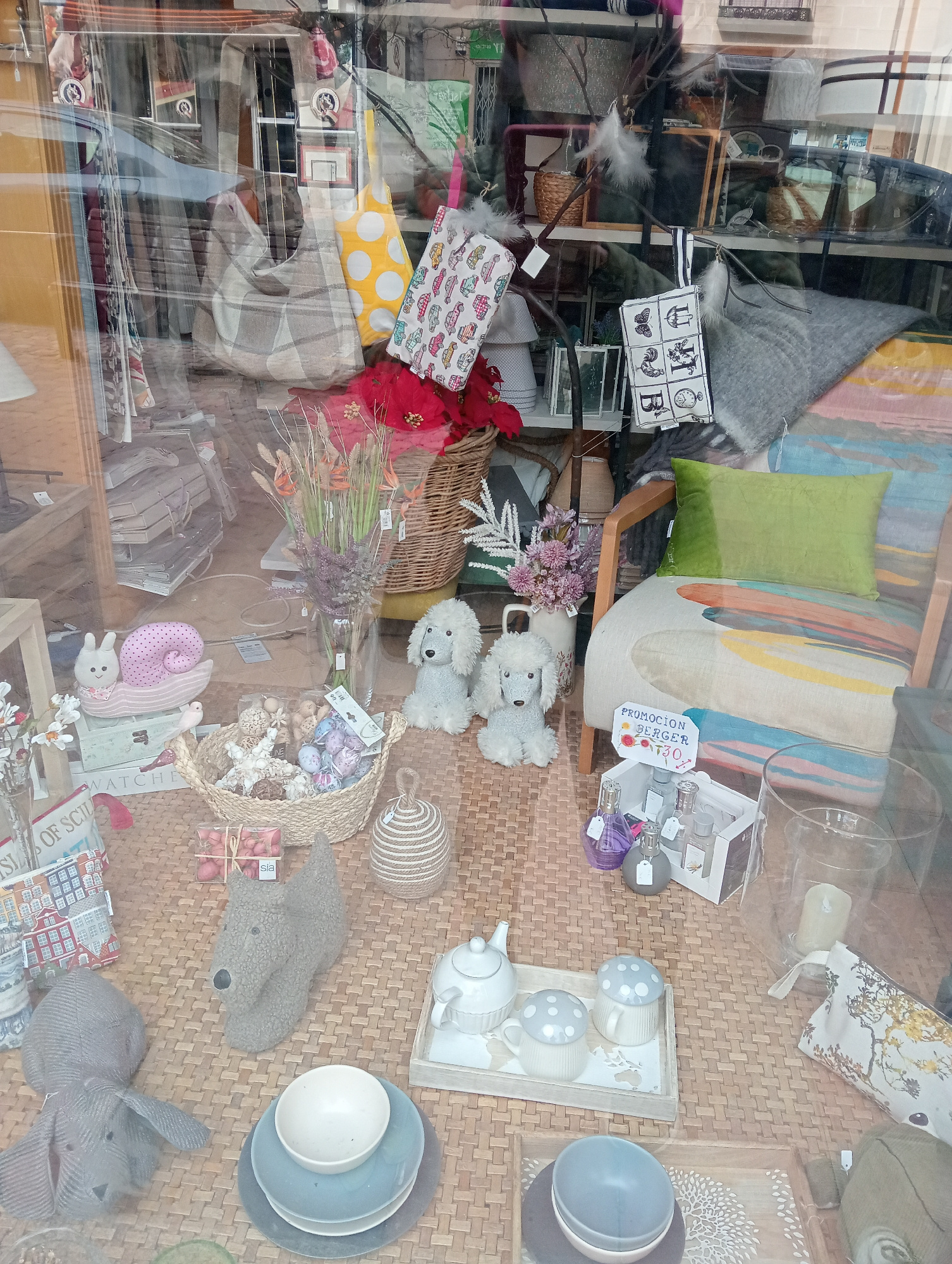 This is a display in the window of a store in Segovia, Spain. The window is reflecting the street outside. A variety of homeware and decorative objects are displayed on a woven mat-like surface. Obje…read more