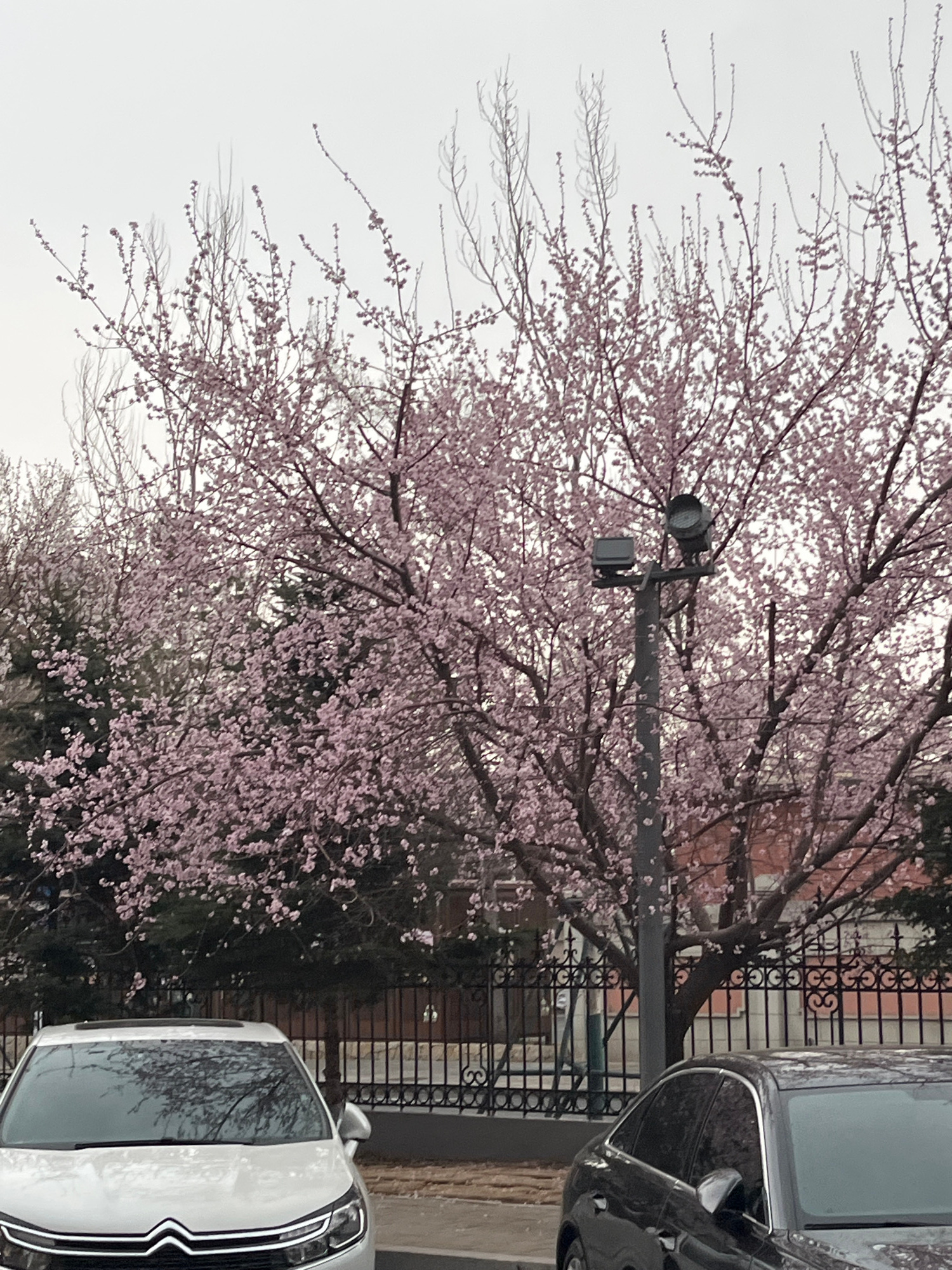The image depicts a street scene in Changchun City, China. A blooming cherry blossom tree is the prominent feature, partially obscuring a street light and a wrought iron fence. Two cars are parked alo…read more