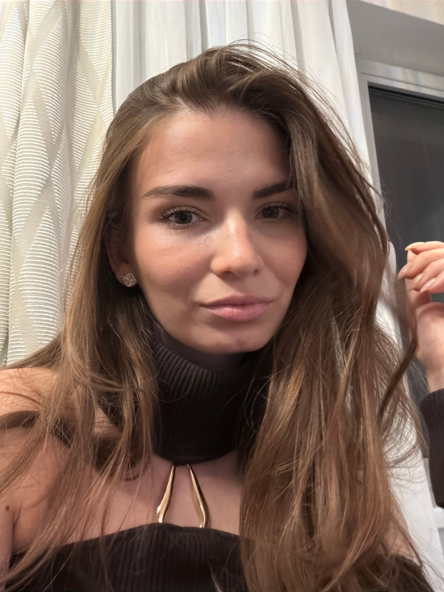 A young woman with light brown hair and a dark turtleneck sweater is facing the camera. She has fair skin, light brown eyes, and pink lips. She wears a diamond earring on her left ear and a gold neck…read more