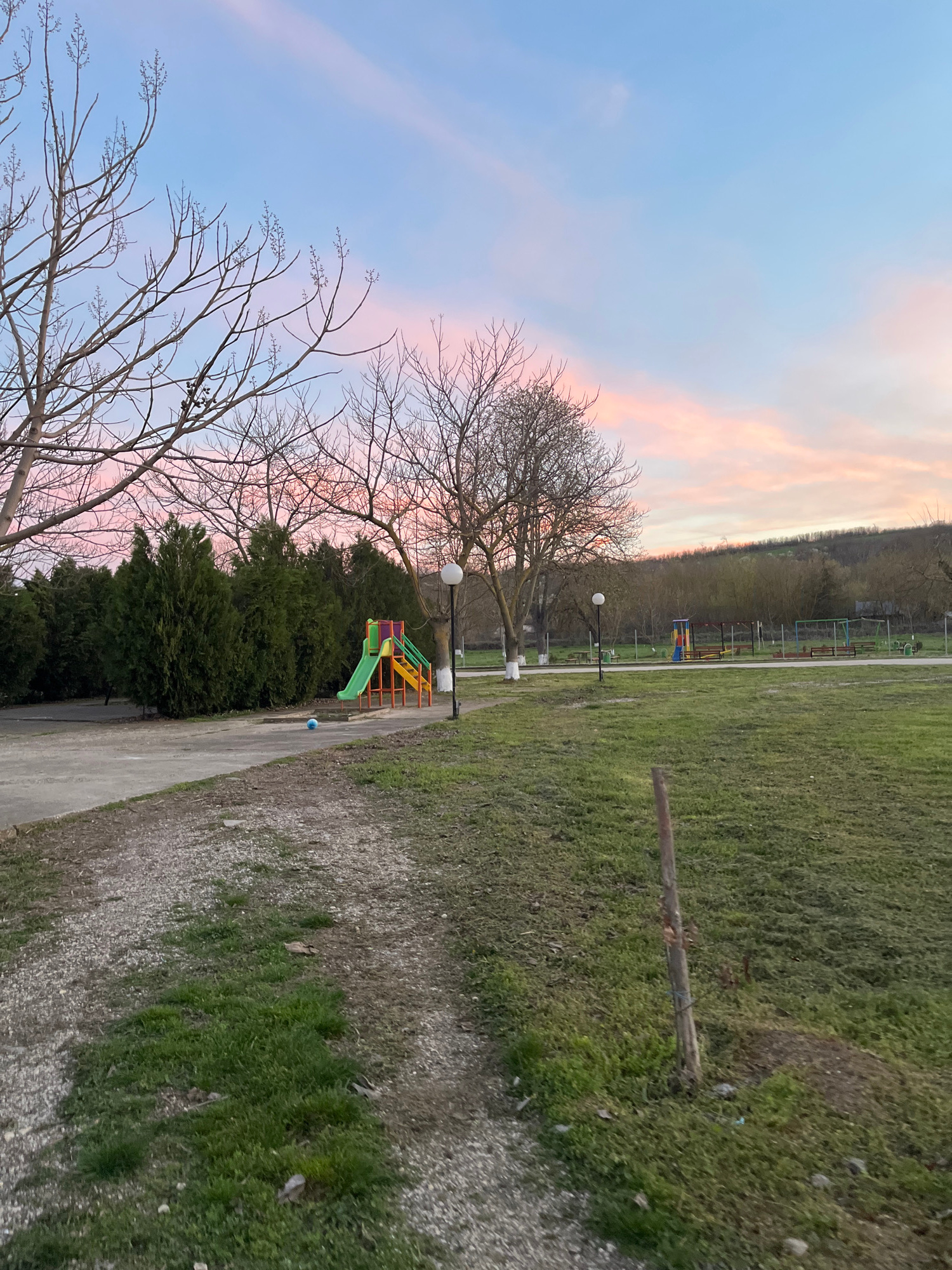 The image depicts a park setting, likely in Pozharevo, Bulgaria. A playground slide with green, yellow, and orange elements sits adjacent to a pathway. The path is bordered by green grass and some tre…read more