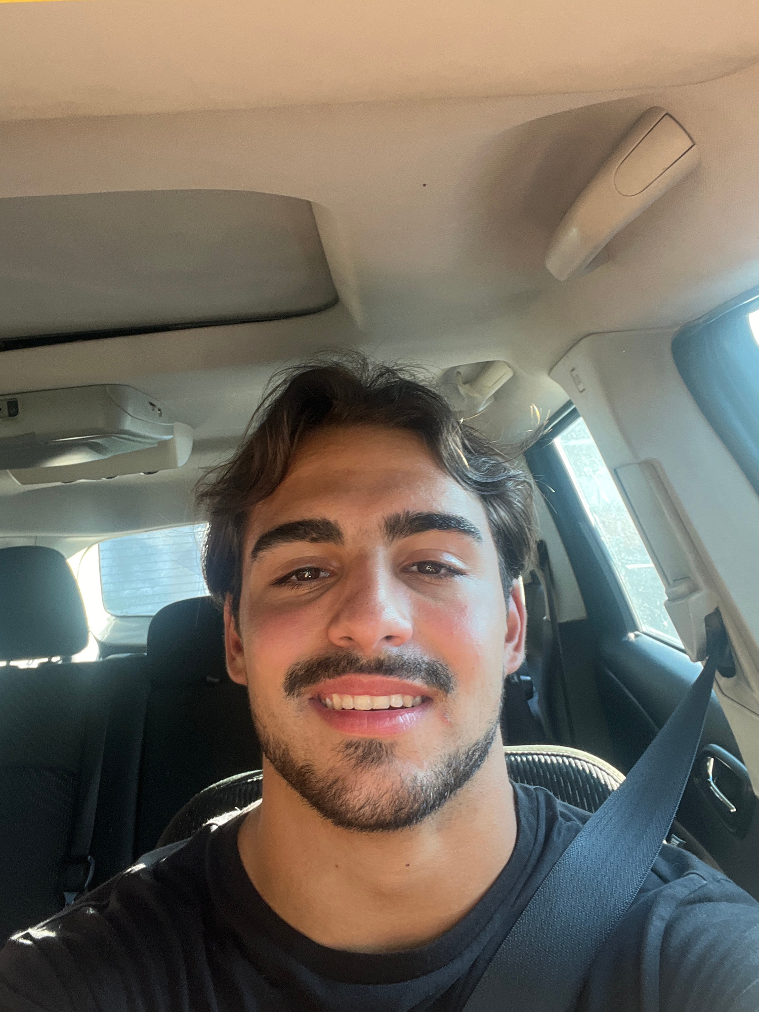 A medium shot shows a man in a car, angled to the left. The man is wearing a seatbelt and has brown hair, brown eyes, and a beard. He is smiling and wearing a black shirt. The car interior is beige an…read more