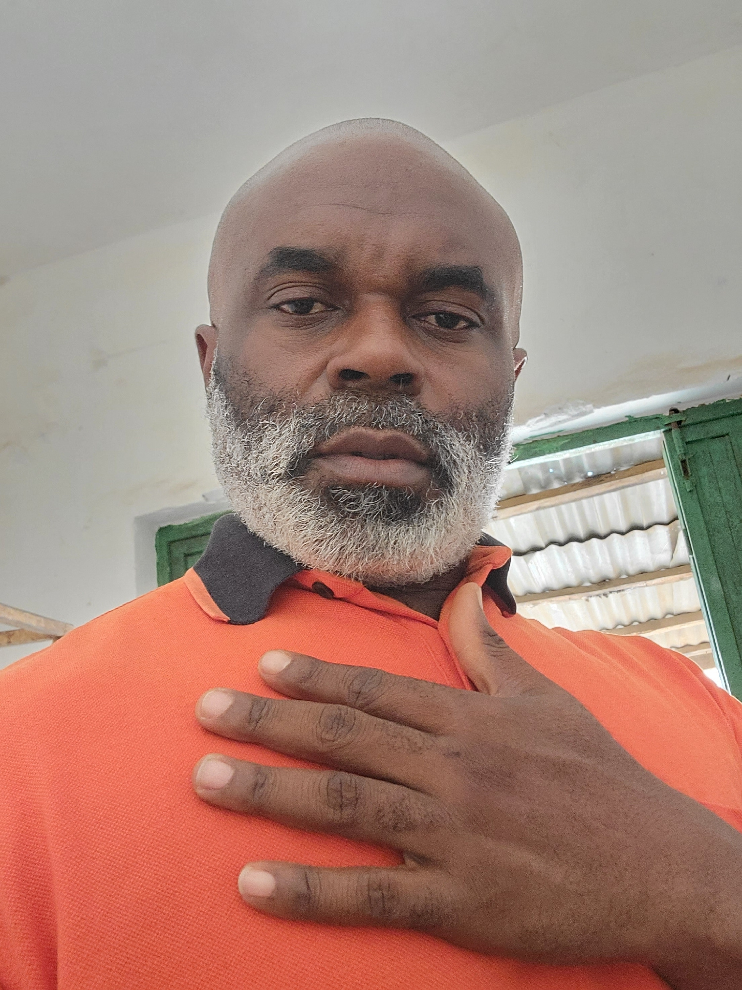 A bald-headed, dark-skinned man with a gray beard is looking directly at the camera. He is wearing an orange shirt with a black collar and has his hand placed on his chest. The background shows a gree…read more