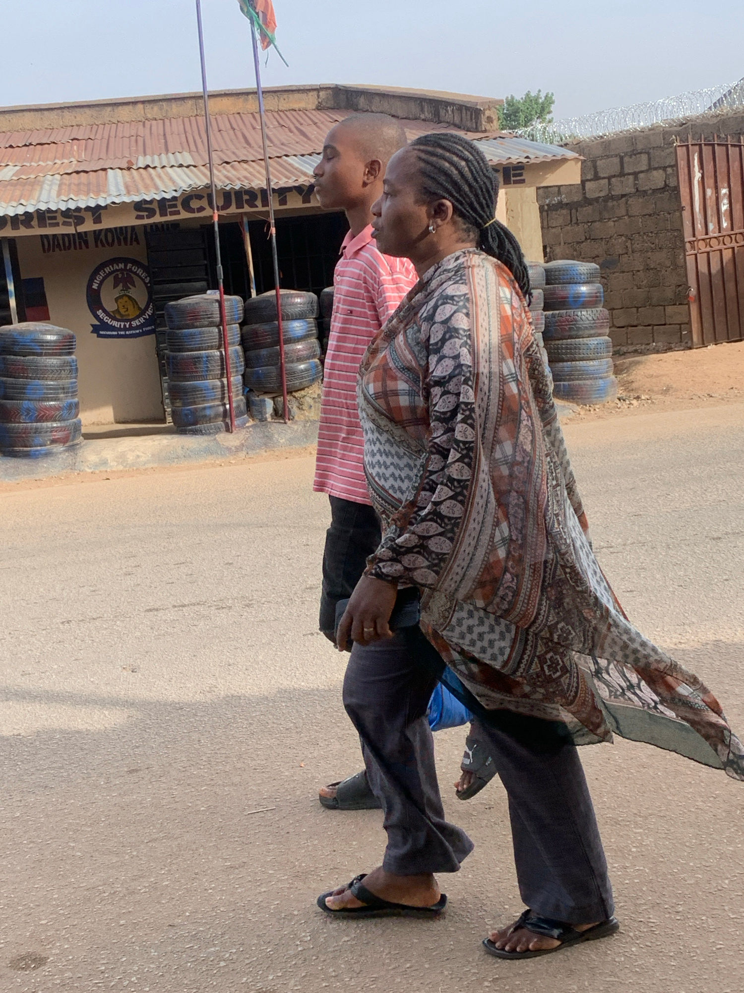 Two people are standing in front of the "Nigerian Forest Service Dadin Kowa Security" building. The building is on the left side of the image, with tires stacked in front of it. One person is wearing…read more