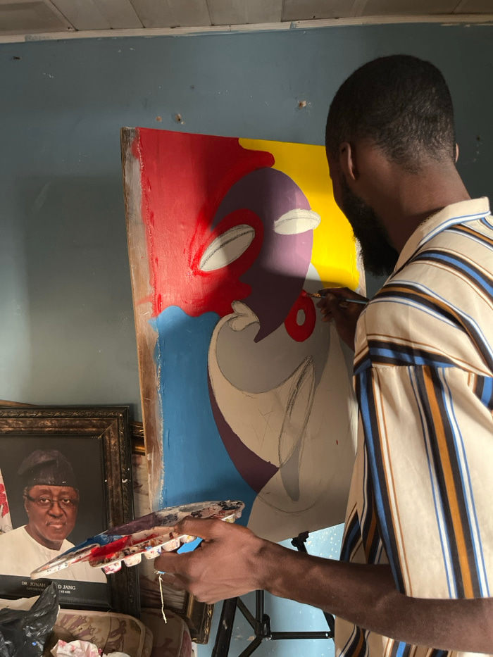 A man with dark hair and a striped shirt stands painting on a large canvas. The artwork features bold blocks of yellow, red, and blue, with purple and light gray shapes resembling abstract figures or…read more