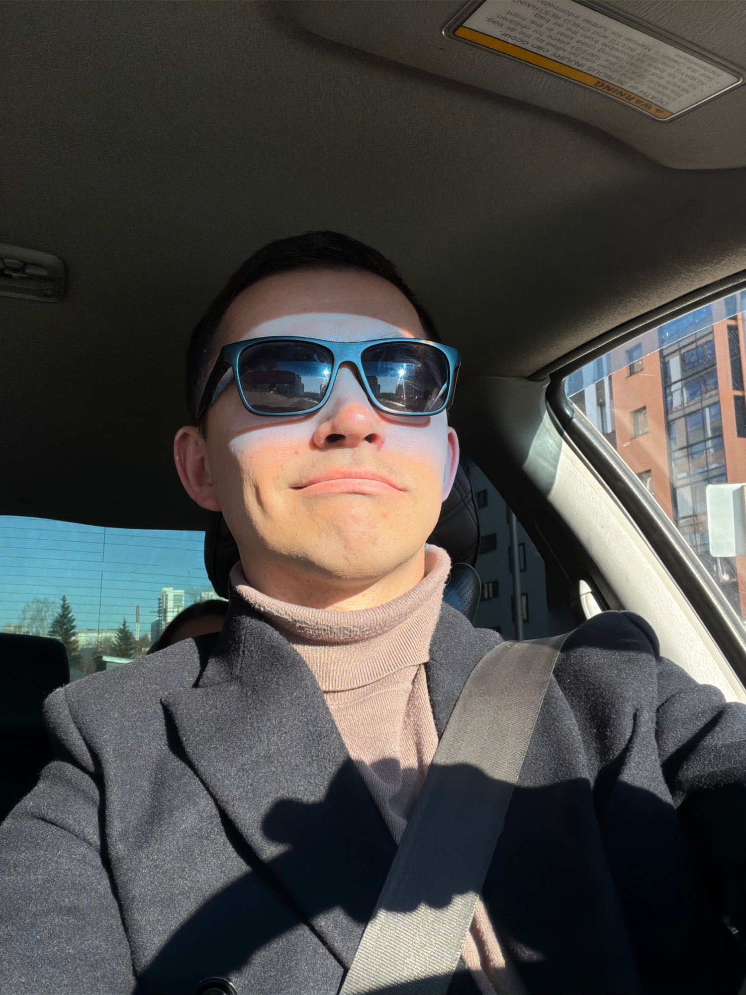 Here is a detailed description of the image: The image shows a man in a car, wearing sunglasses and a coat. He is wearing a seatbelt. The sun is shining on his face. There is a building visible throu…read more
