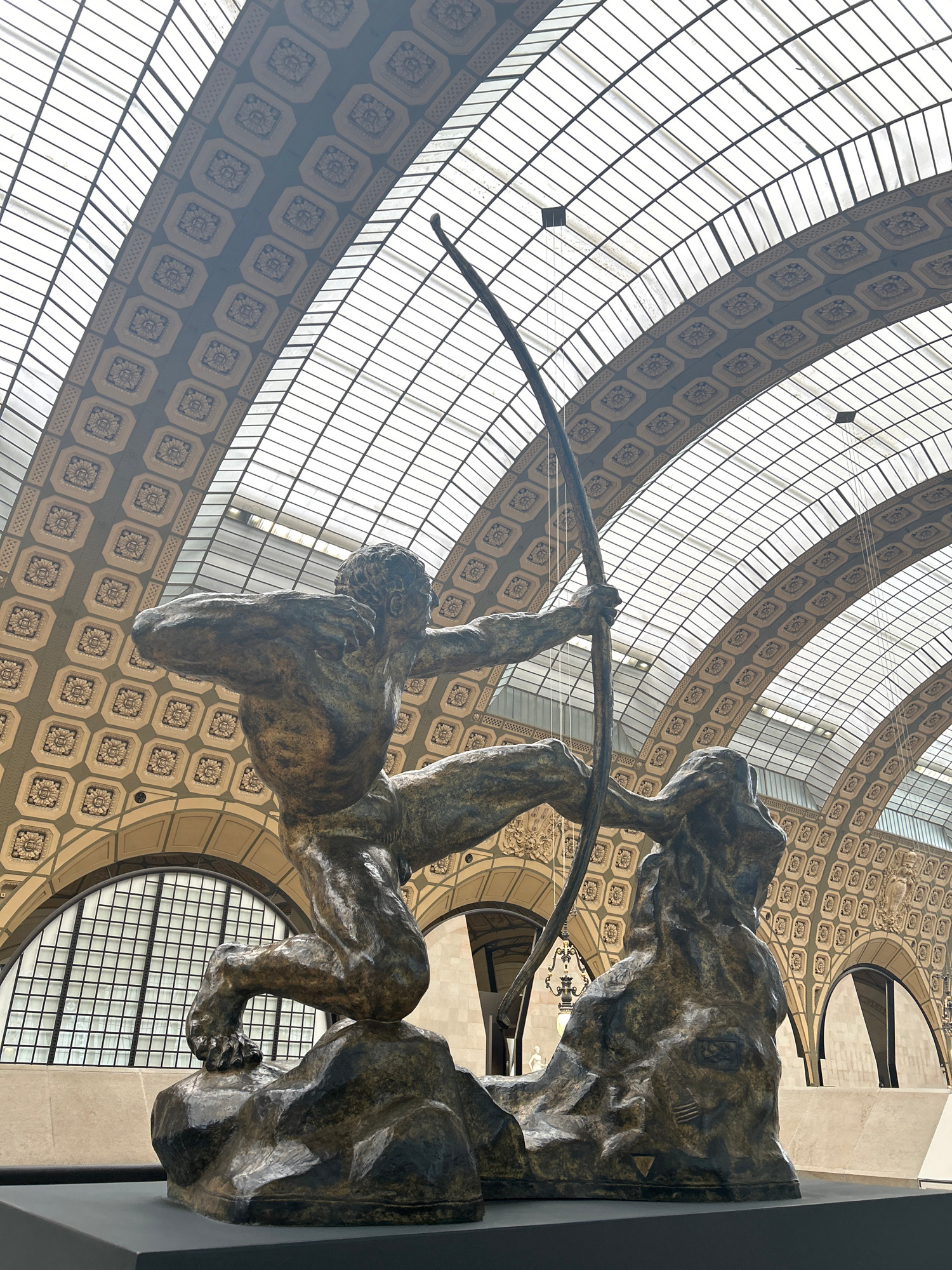 The photograph, taken from a low angle, depicts a bronze sculpture of a male figure drawing a bow and arrow, set against the backdrop of a glass-paneled dome and intricately patterned ceiling. The fig…read more