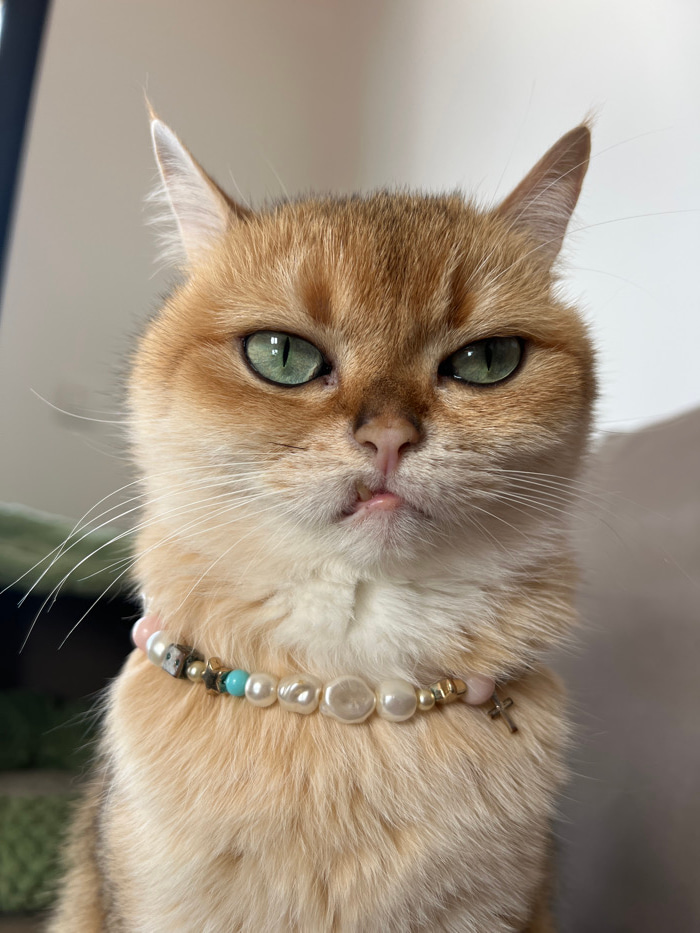 A domestic cat is depicted in a close-up indoor portrait, reportedly in Bjeliši, Montenegro. The animal possesses golden-orange fur with lighter cream-colored markings on its face and chest. Its eyes…read more