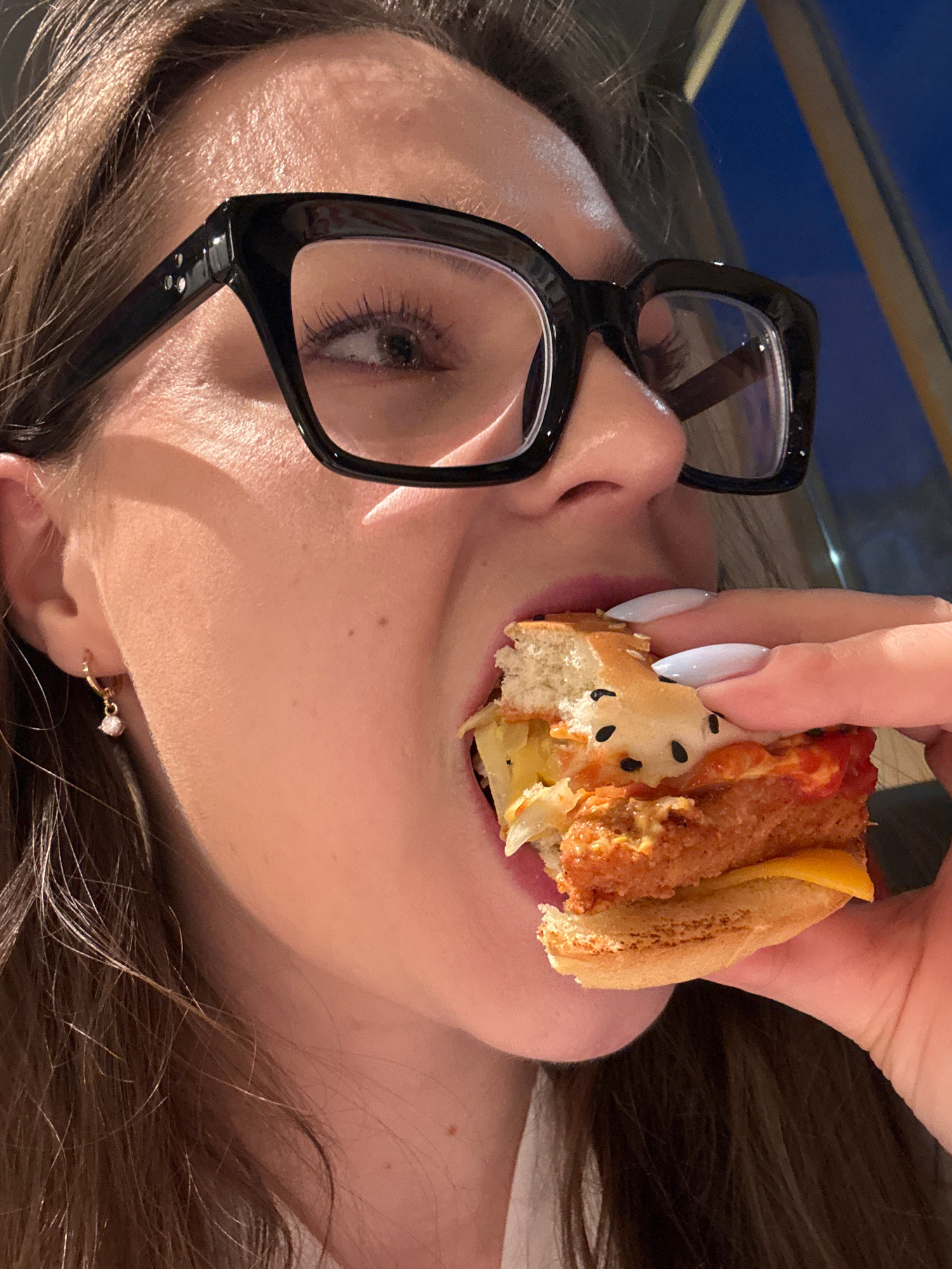 A close-up, angled shot captures a person, likely female, eating a small hot dog or mini sandwich. The person is positioned with their head tilted upwards, possibly lying down. They wear black, thick-…read more