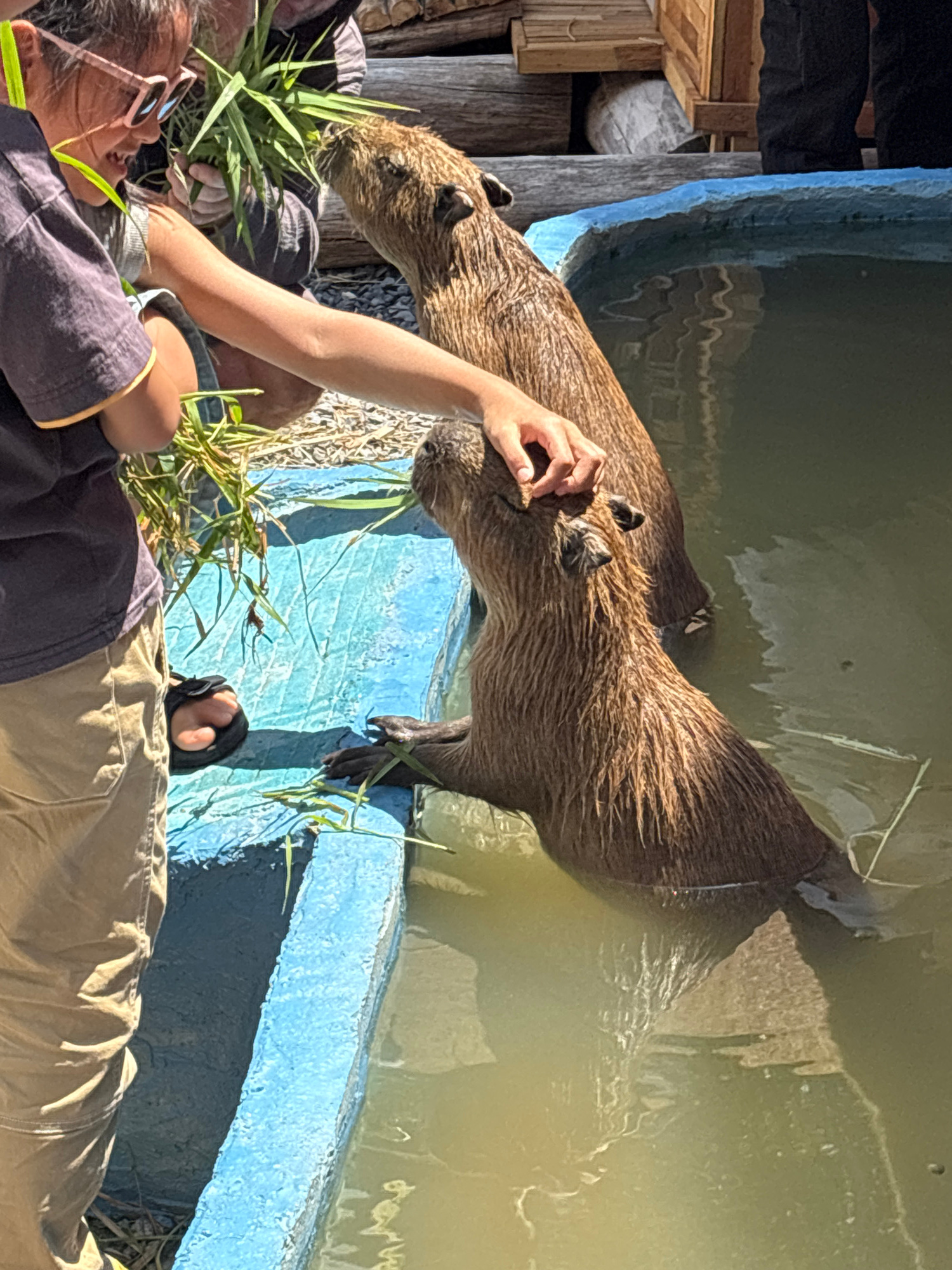 The image shows two capybaras, one standing on its hind legs, interacting with a person lying down. The capybara standing is partially submerged in water with its front paws resting on the edge of a b…read more