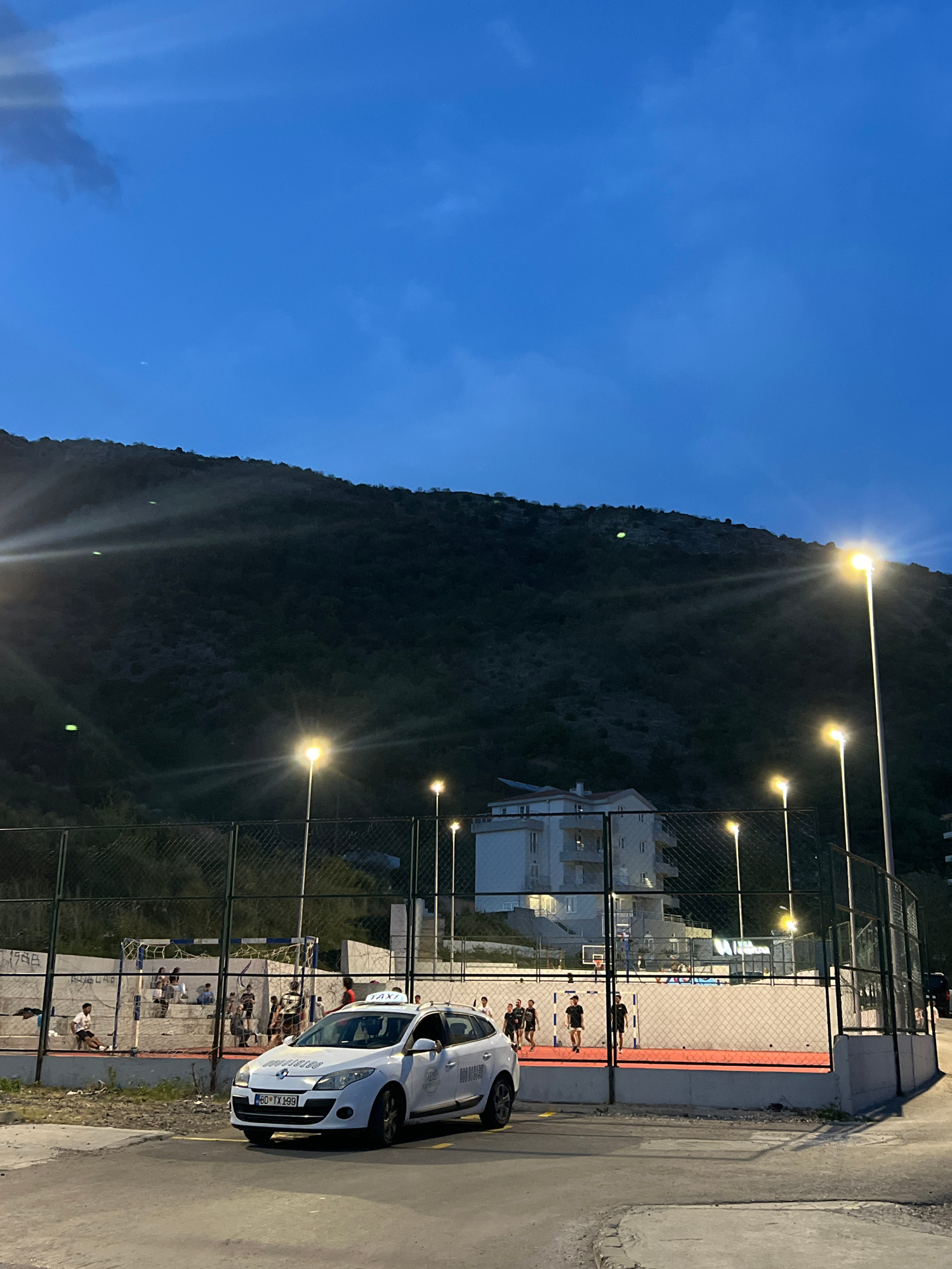 The image depicts an outdoor scene in Boreti, Montenegro, at dusk. A large mountain forms the backdrop, illuminated by streetlights. A white taxi with license plate "BD-TX-499" is parked along the rig…read more