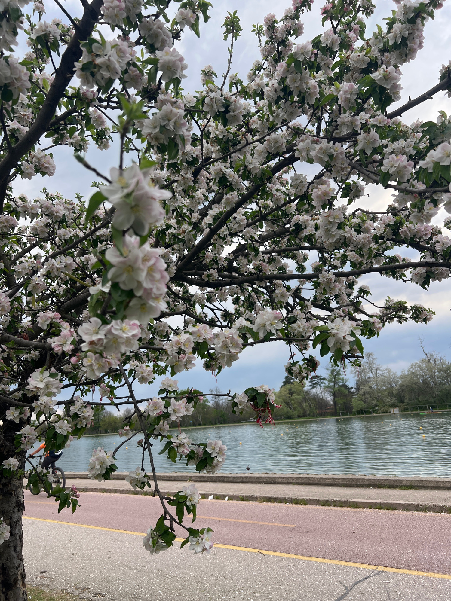 The image captures a vibrant springtime scene dominated by a blossoming tree in full bloom. The tree, likely an apple or cherry varietal, occupies the left and foreground of the frame, its dark branch…read more