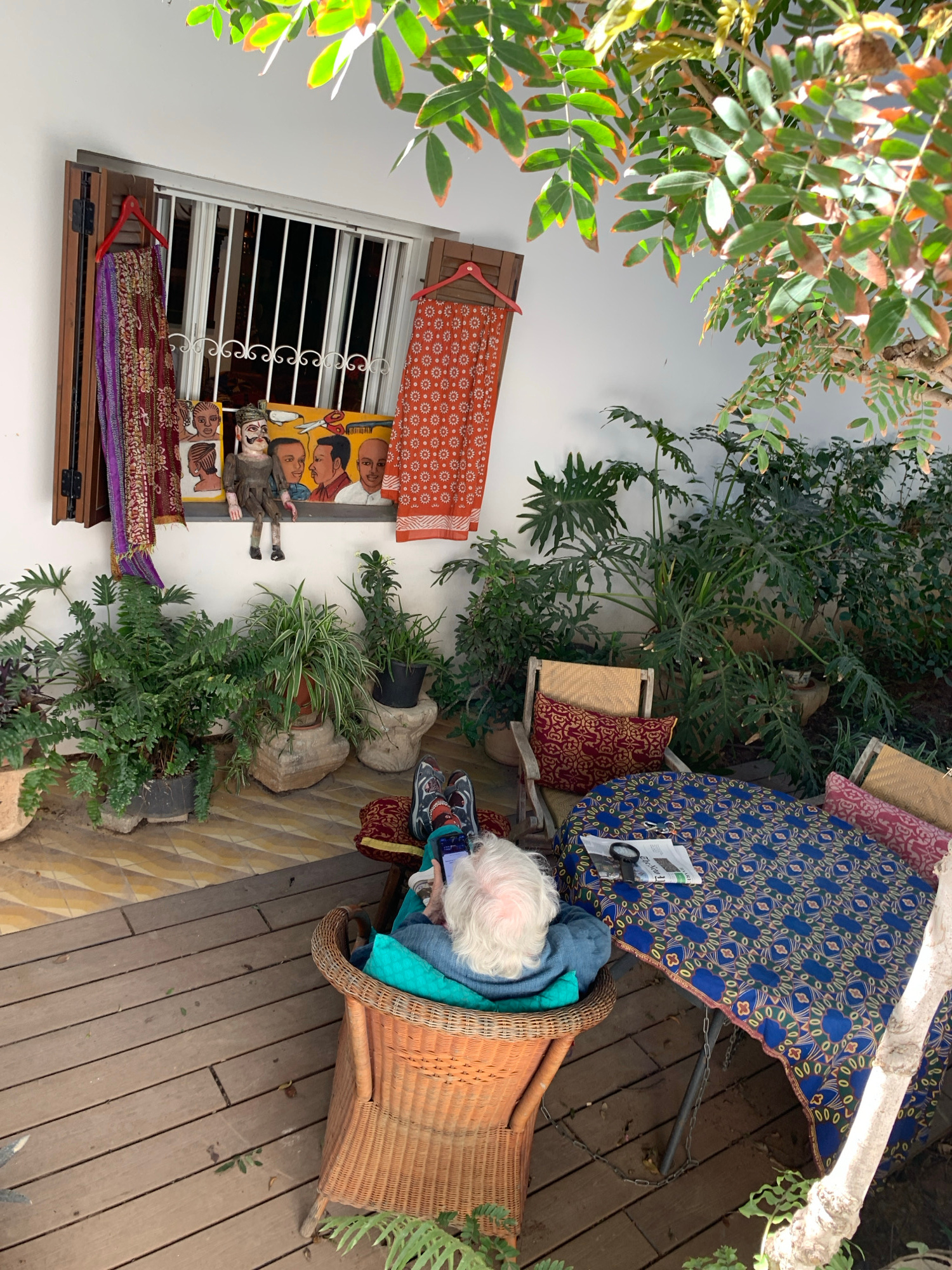 A person with white hair sits in a woven chair on a wooden deck surrounded by lush greenery. The person is wearing casual clothing and appears to be engaged with a smartphone. Next to the chair is a s…read more