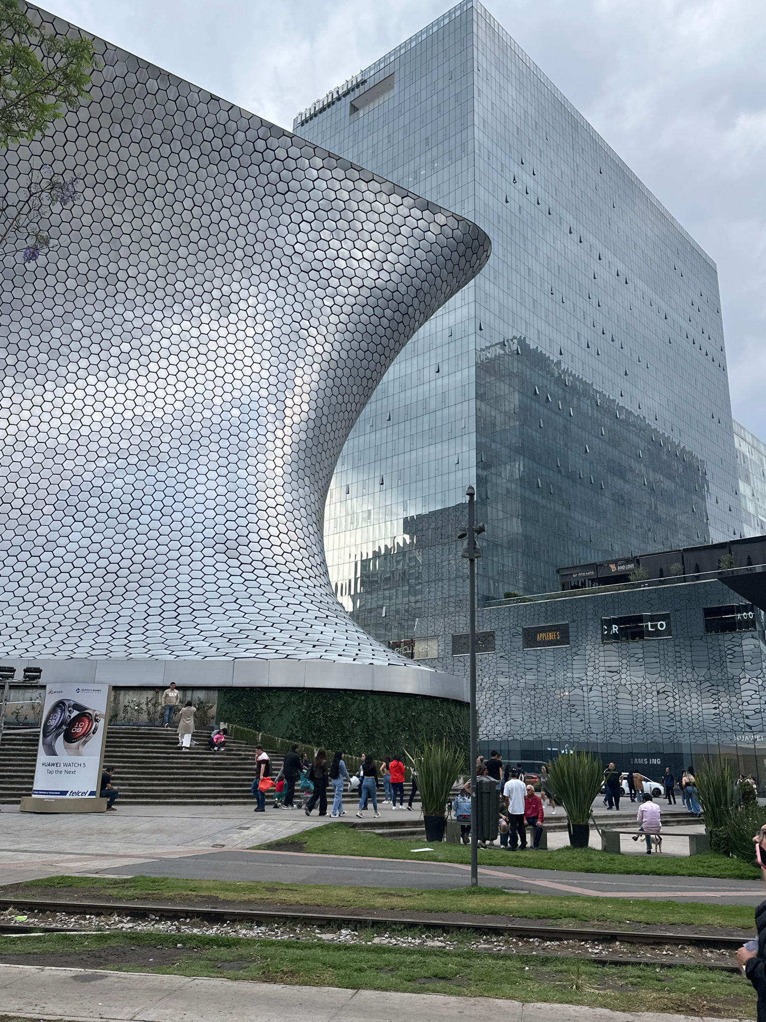 The image captures a street scene in Mexico City, Mexico, showcasing a modern architectural landscape. The Soumaya Museum is prominently featured, with its unique, curvilinear structure covered in hex…read more