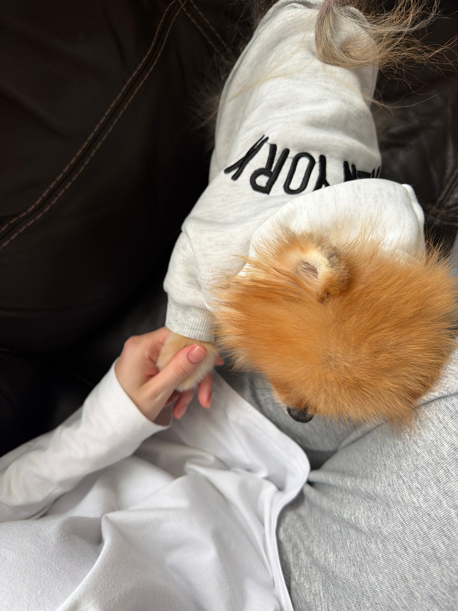 A high-angle shot shows a person holding the paw of a Pomeranian dog. The person is wearing a white long-sleeved shirt and gray sweatpants, and their hand is holding the dog's paw. The dog is wearing…read more