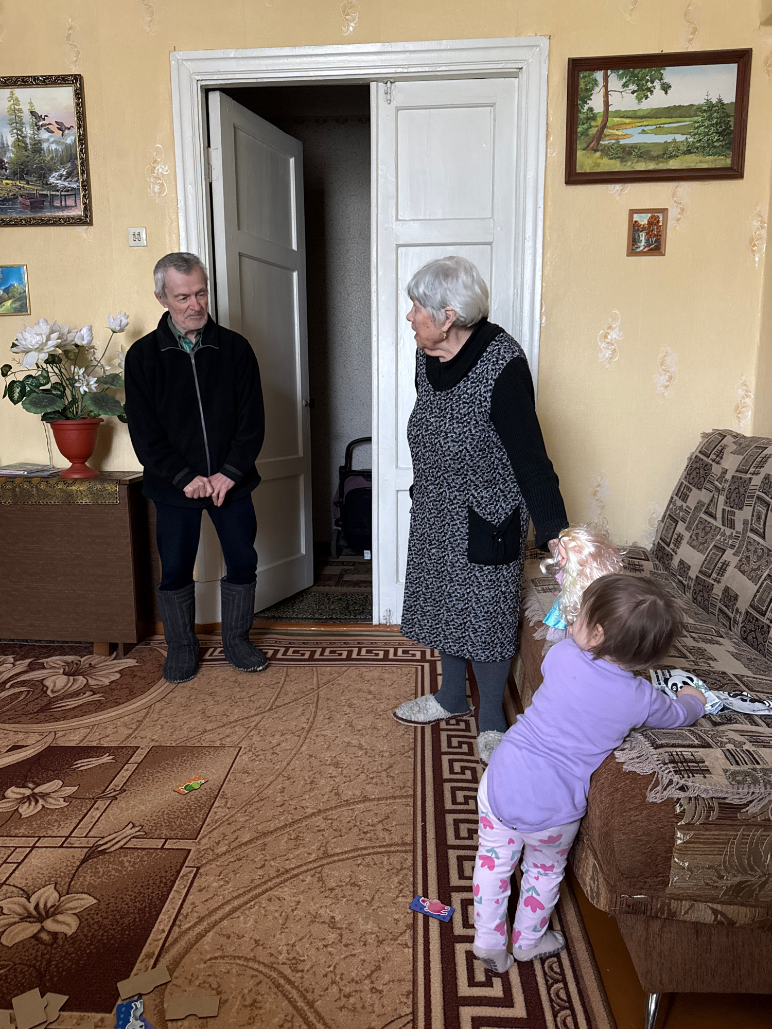 Location: Vyshegor, Russia Scene: An interior view showing three people. An elderly man stands near a doorway, wearing a black jacket, dark pants, and felt boots. An elderly woman is leaning over a c…read more
