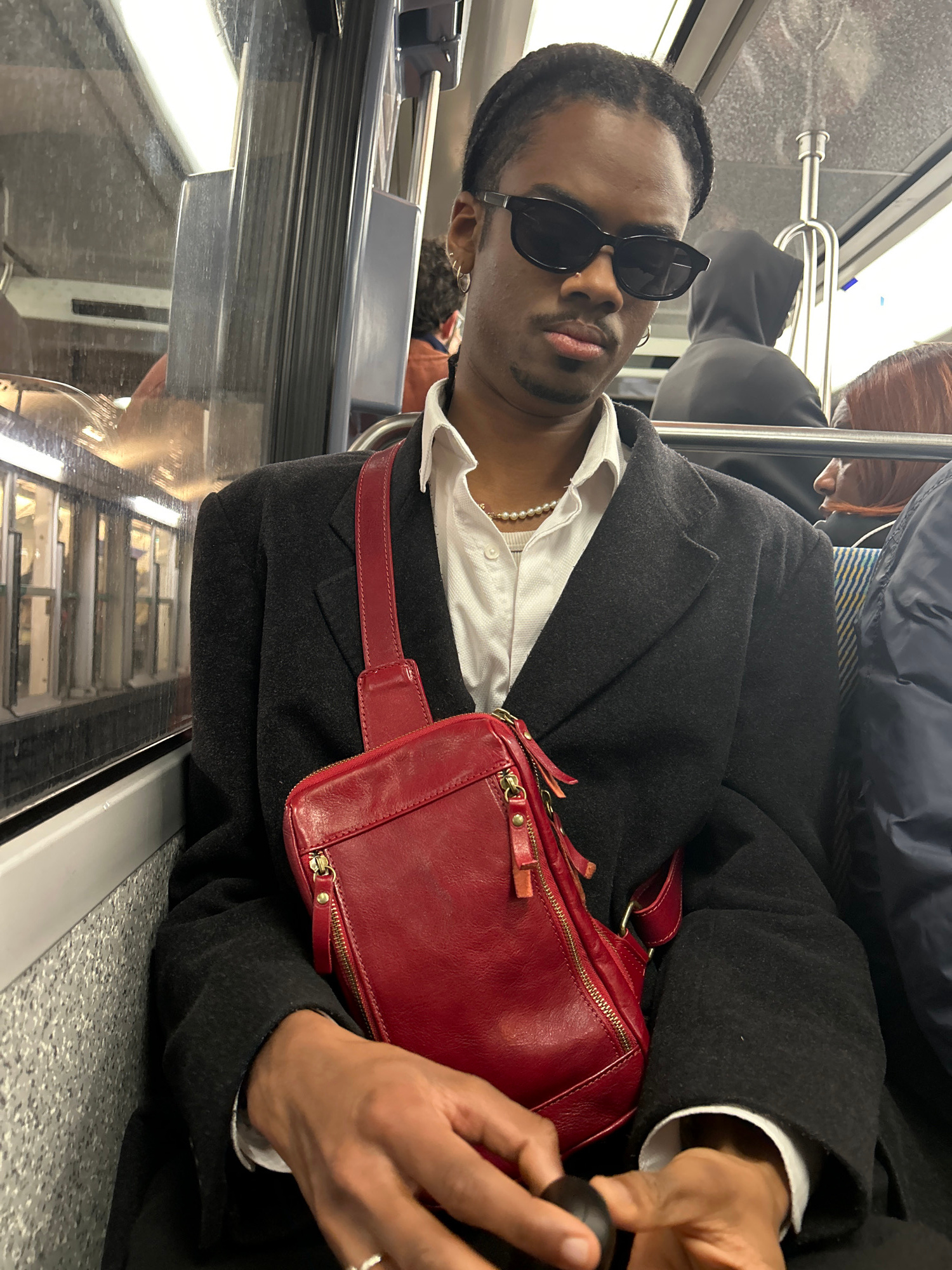 A medium shot shows a person wearing sunglasses, a pearl necklace, a white shirt, and a dark-colored coat. A red leather bag is draped across their lap. The scene appears to be inside a train car, infβ¦read more