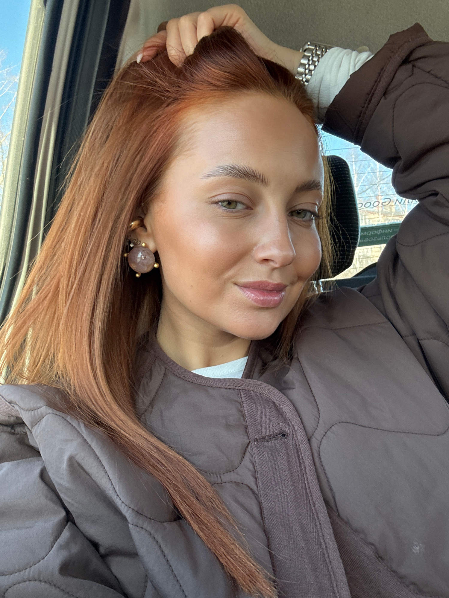 A close-up, tilted selfie captures a woman inside what appears to be a vehicle. She has long, straight, reddish-brown hair that falls over her shoulders. Her light-colored eyes (possibly green or haze…read more