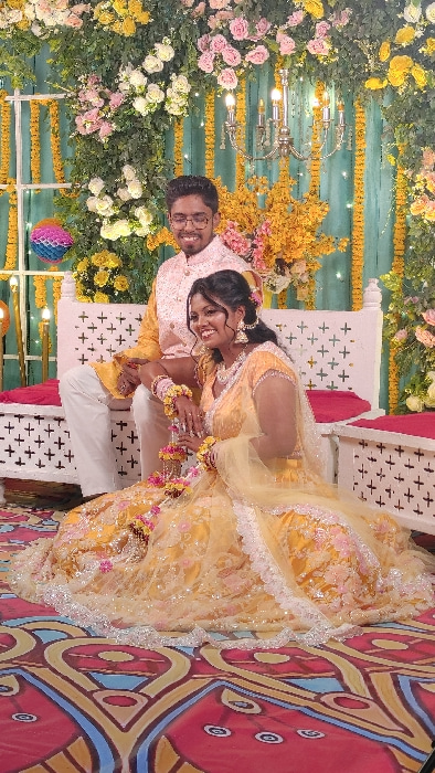 An indoor event in Dhaka, Bangladesh, features a young adult couple against a decorative floral backdrop. The male, approximately in his late 20s, is seated on a white carved wooden bench. He wears ey…read more