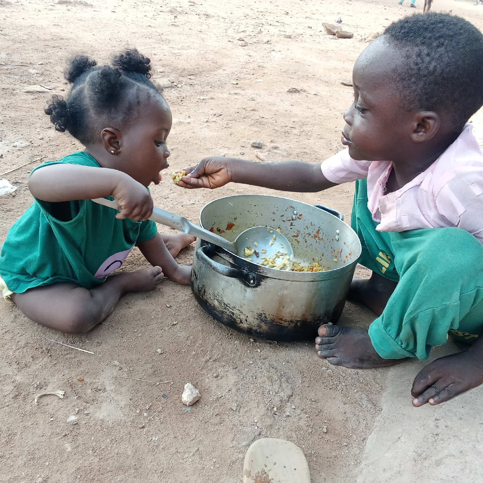 Two young children are sharing a meal directly from a large, well-used aluminum cooking pot, seated on the bare, sandy ground. The scene appears to be outdoors in a dry, warm environment in Akwanga, N…read more