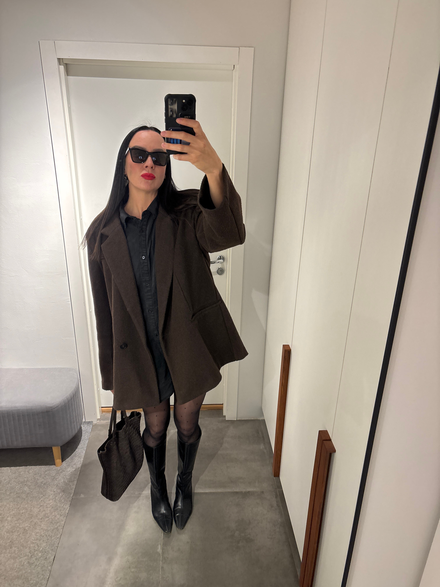 An upright mirror selfie captures a stylish woman in an indoor setting, likely in Chaikovsky, Russia. The woman, with long dark hair, is wearing a dark brown, possibly wool, coat over a dark shirt, wh…read more