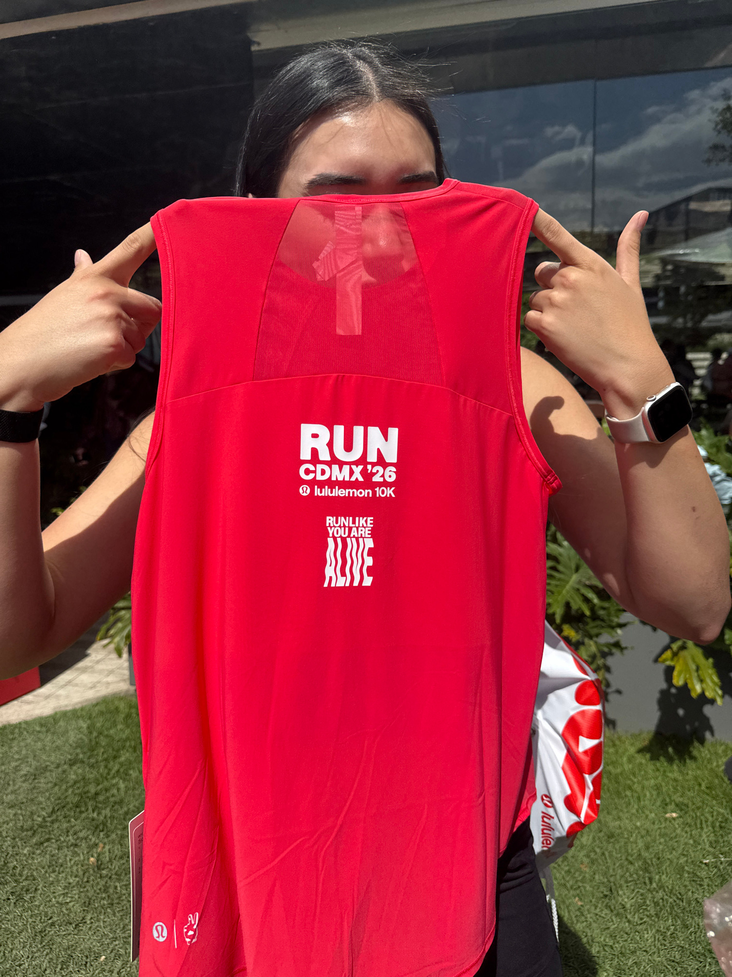 A woman is holding a red sleeveless running shirt that says "RUN CDMX '26 @ lululemon 10K RUN LIKE YOU ARE ALIVE" in front of her face. Her fingers on both hands are pointing at the shirt. She is wear…read more