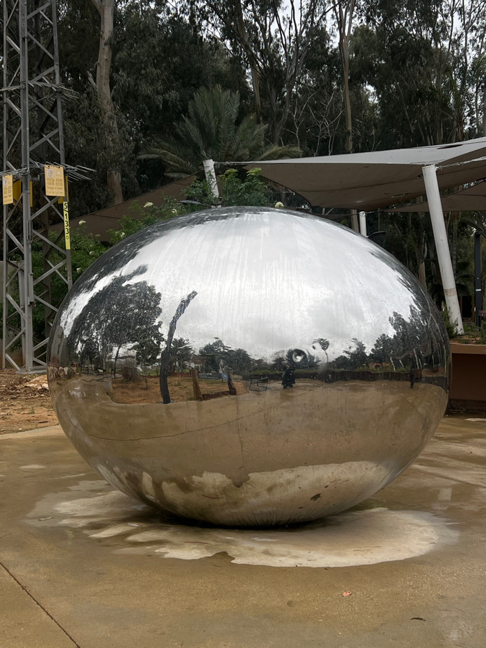 The image displays a large, highly reflective spherical metallic sculpture positioned centrally on a light-colored concrete or paved surface exhibiting wet patches, particularly around the sculpture's…read more