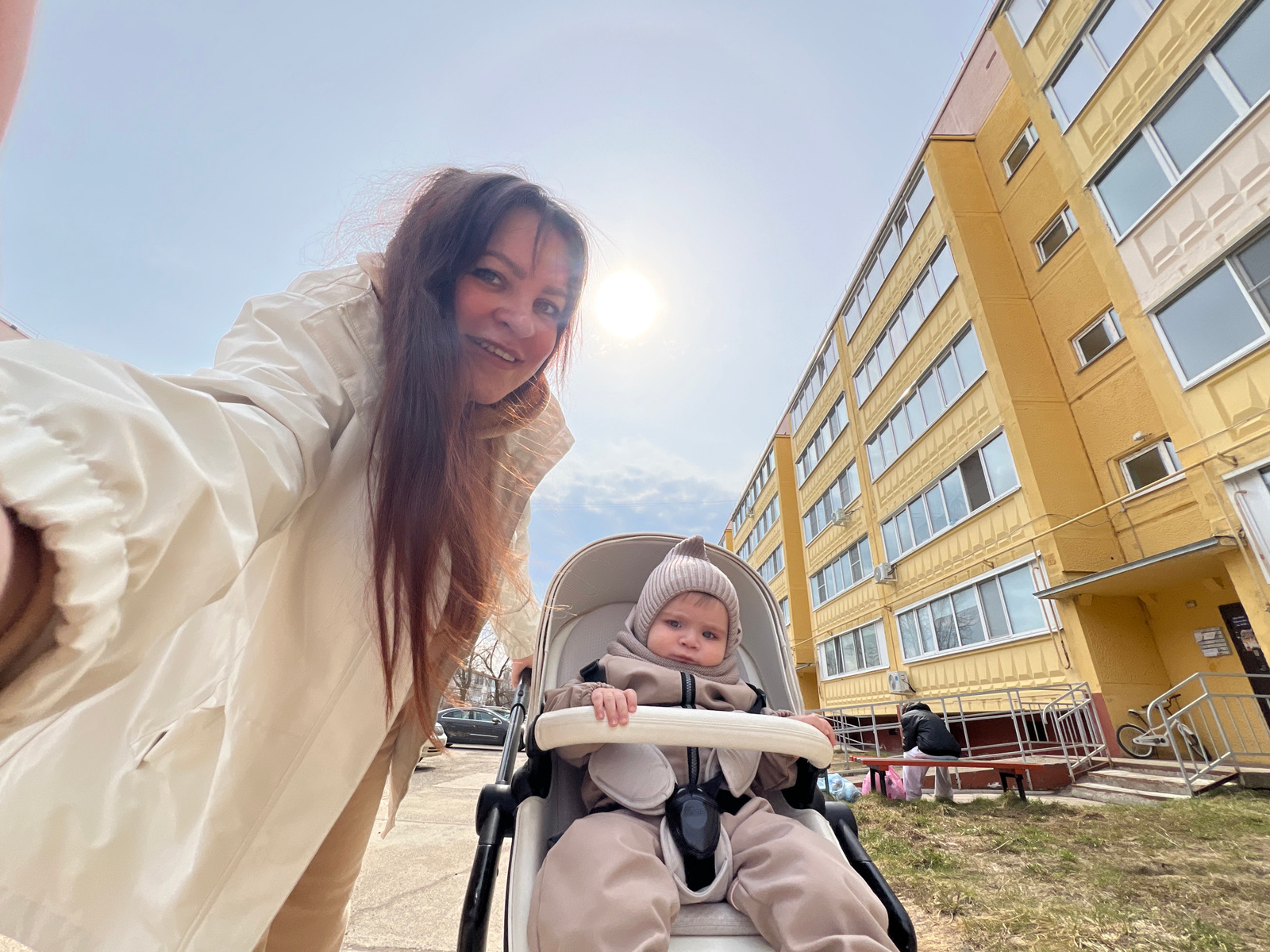 A low-angle view features a fair-skinned woman with long brown hair holding a baby in a stroller with the building and sky in the background. The woman’s face is slightly visible, with a hint of a smi…read more