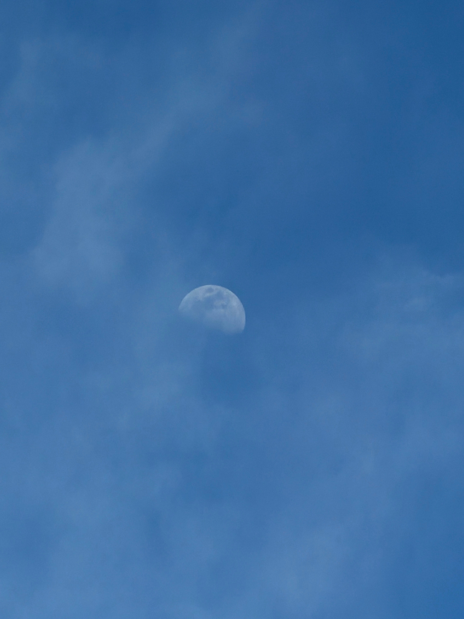 The image displays a daytime sky, predominantly clear blue, with scattered, thin, and diffuse white cloud formations. A celestial body, identified as the Moon, is positioned slightly above the vertica…read more