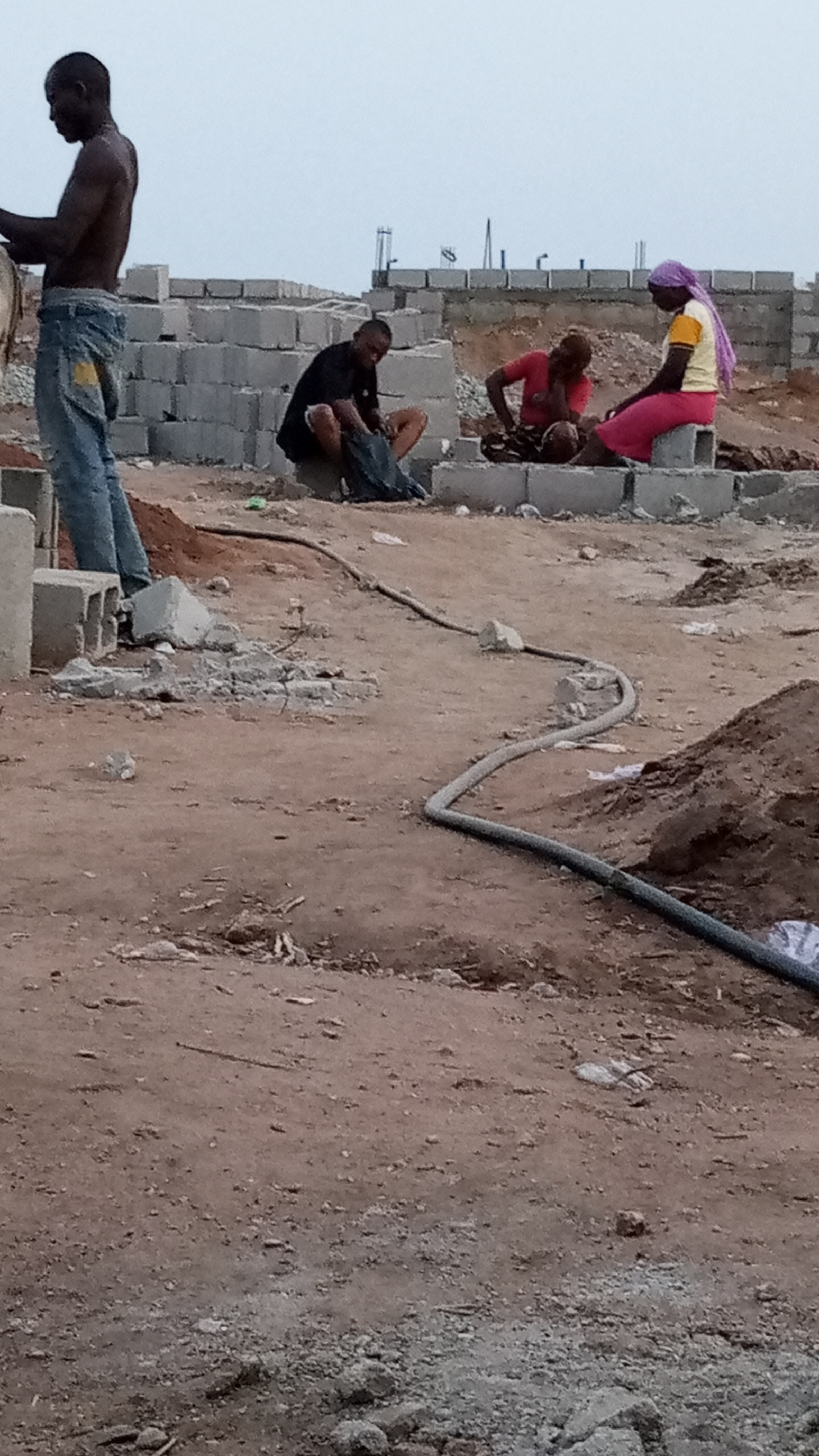 The image depicts an outdoor construction site in Adankolo, Nigeria. There are four individuals present. One man, shirtless and wearing jeans, stands on the left side of the frame. A second man in a b…read more