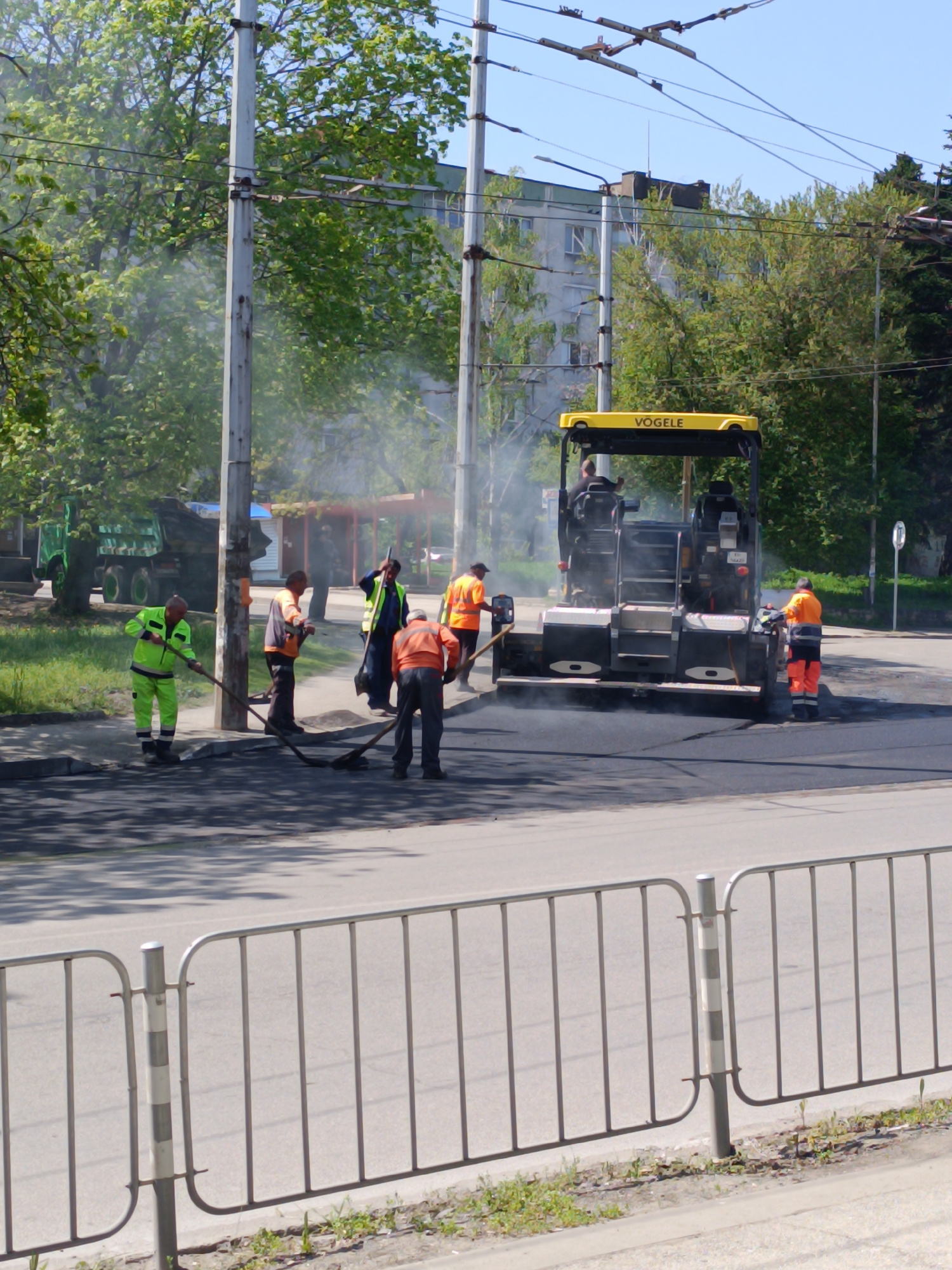 The image depicts a road paving operation taking place on a bright, sunny day in an urban environment, likely in Pleven, Bulgaria. Central to the scene is a large, yellow and black "VÖGELE" asphalt pa…read more