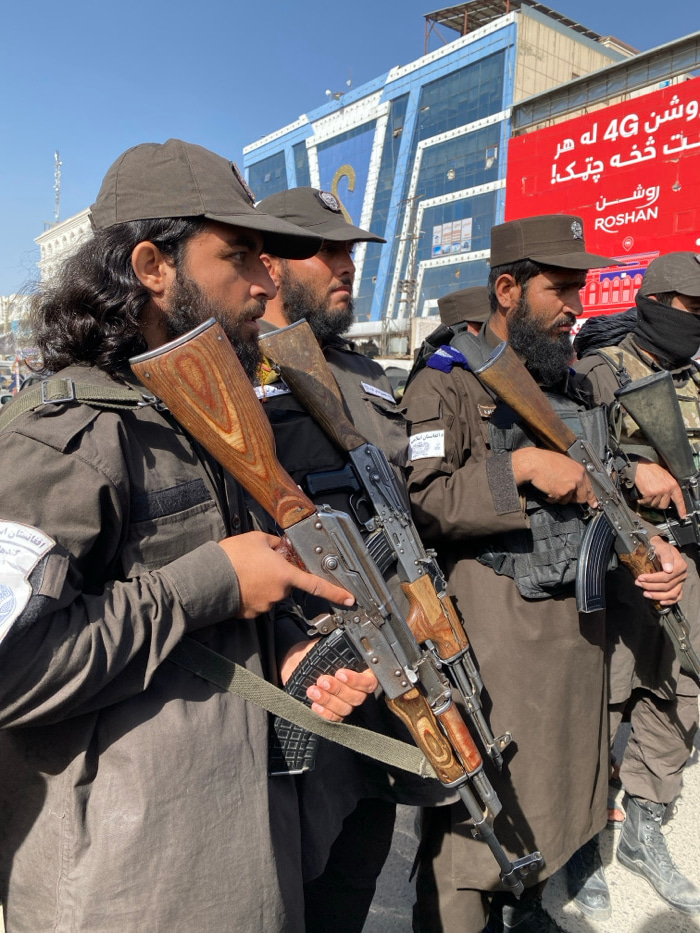 The image depicts a ground-level view of at least five armed men standing in an urban area of Kandahar, Afghanistan, on a clear, sunny day. In the foreground, from left to right, are three prominent…read more
