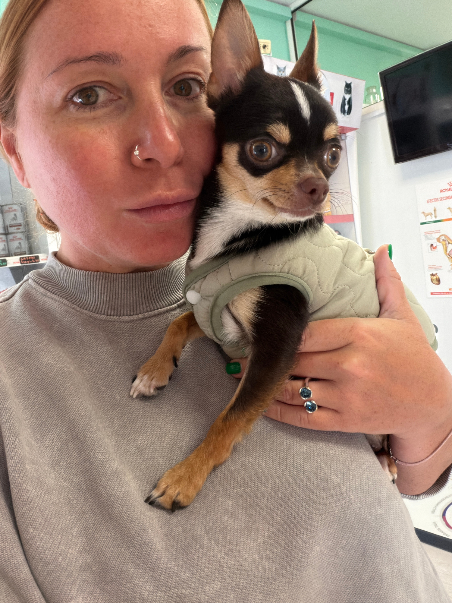 A woman is holding a small dog in a light green quilted jacket. The dog has brown, black, and white fur. The woman is wearing a light grey sweatshirt and has a ring with two blue stones on her hand. S…read more