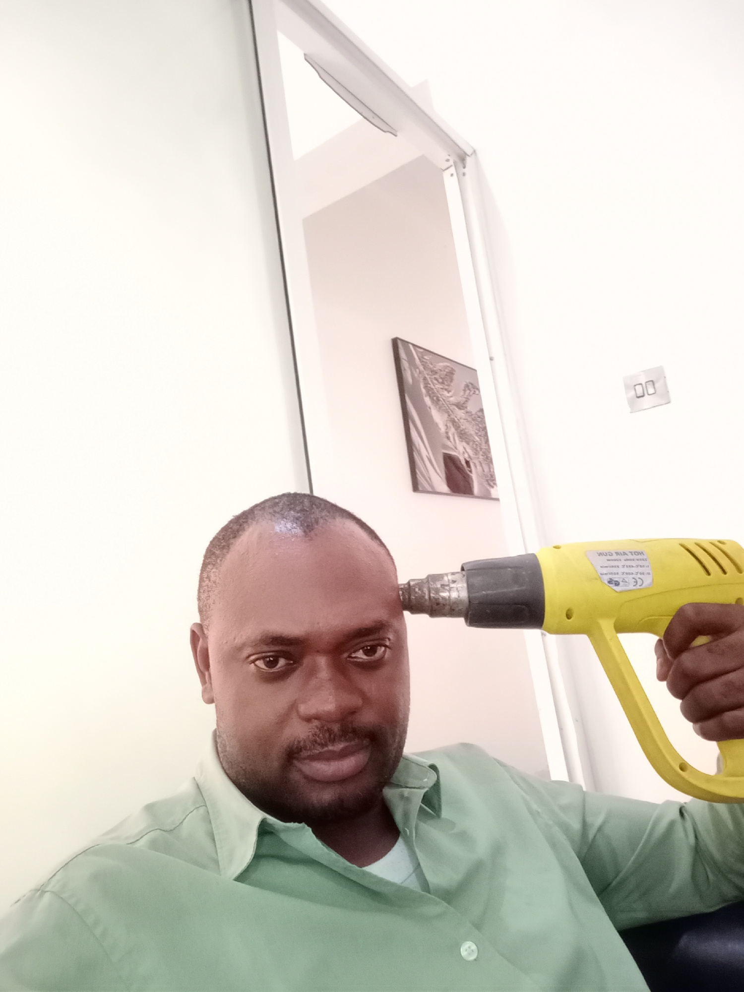 A man of African descent is depicted in a close-up, chest-up shot, holding a bright yellow heat gun to his forehead. He wears a light green collared shirt and has short dark hair and a beard, looking…read more