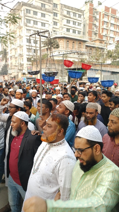 This image presents a dense, daytime street scene in an urban area of Dhaka, Bangladesh, featuring a large crowd of predominantly adult men. **People:** The foreground and midground are filled with n…read more