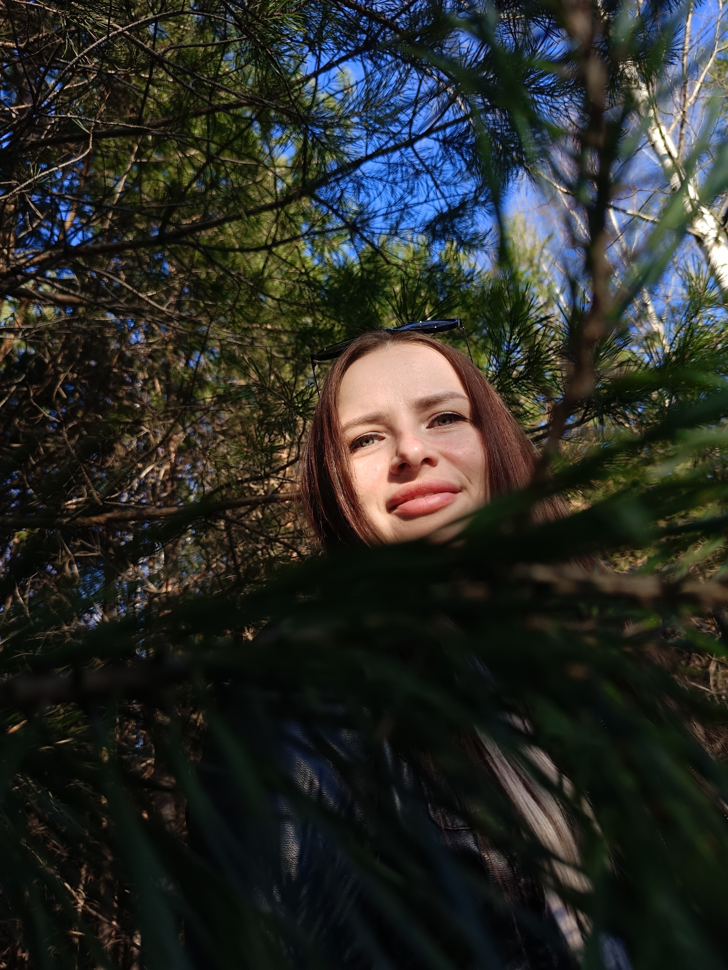 A young woman is captured in a close-up, low-angle portrait amidst a natural forest setting. She is seen from the chest up, with long, dark brown hair flowing around her shoulders. Sunglasses are perc…read more