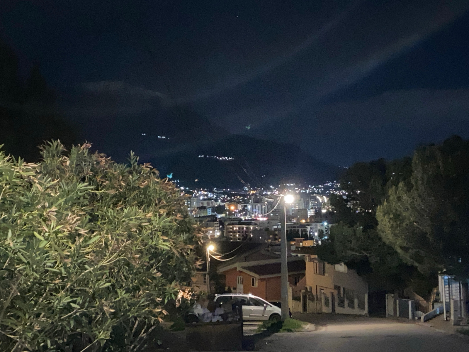 Nighttime view in Šušanj, Montenegro. The scene features a street lined with houses and vegetation. A white van is parked near a house. Streetlights illuminate the area. In the distance, city lights a…read more
