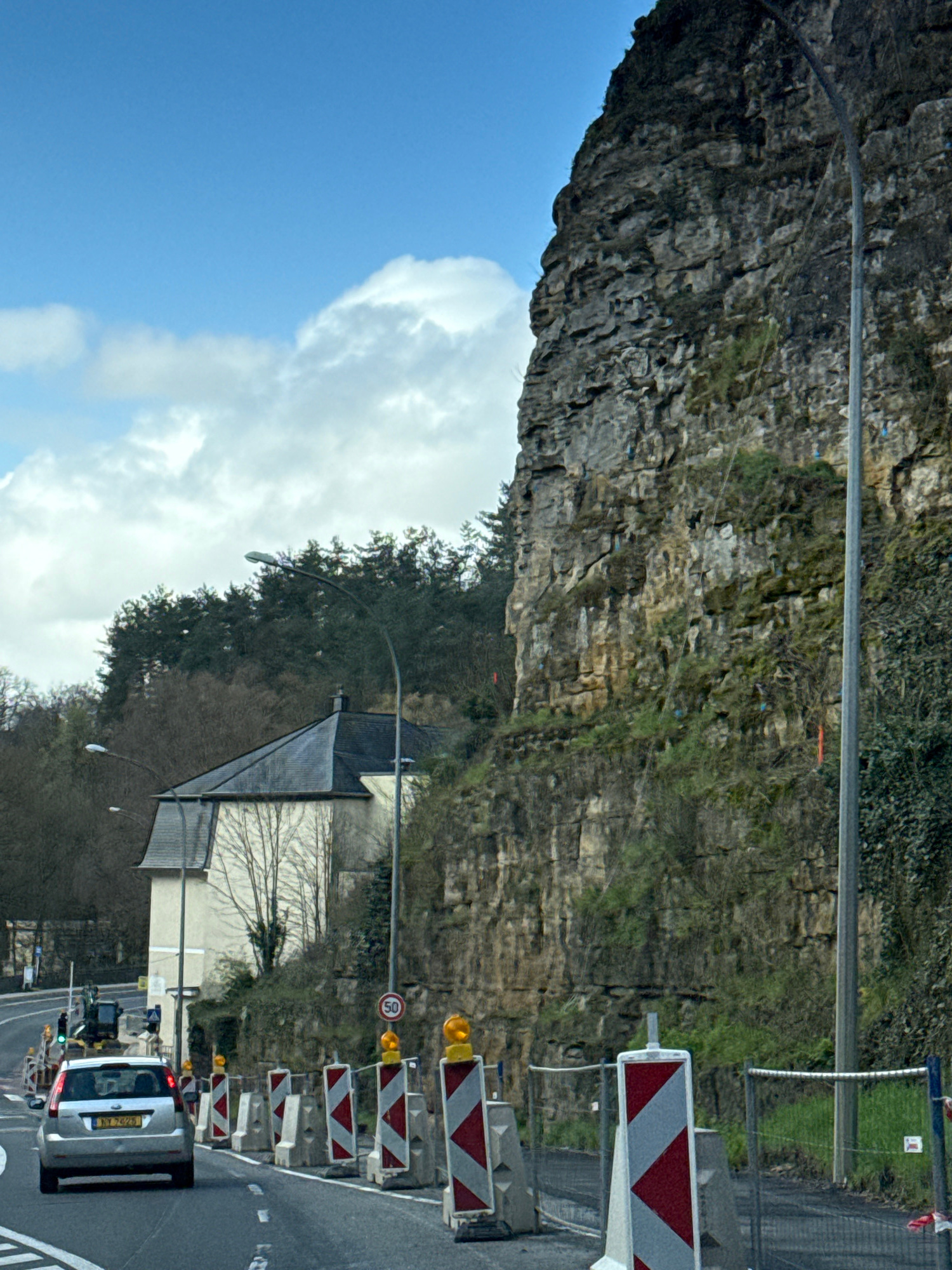 The image shows a road in Luxembourg City, Luxembourg, next to a rock face. A silver SUV with a visible license plate is driving on the road. Construction barriers and flashing lights line one side ofโ€ฆread more