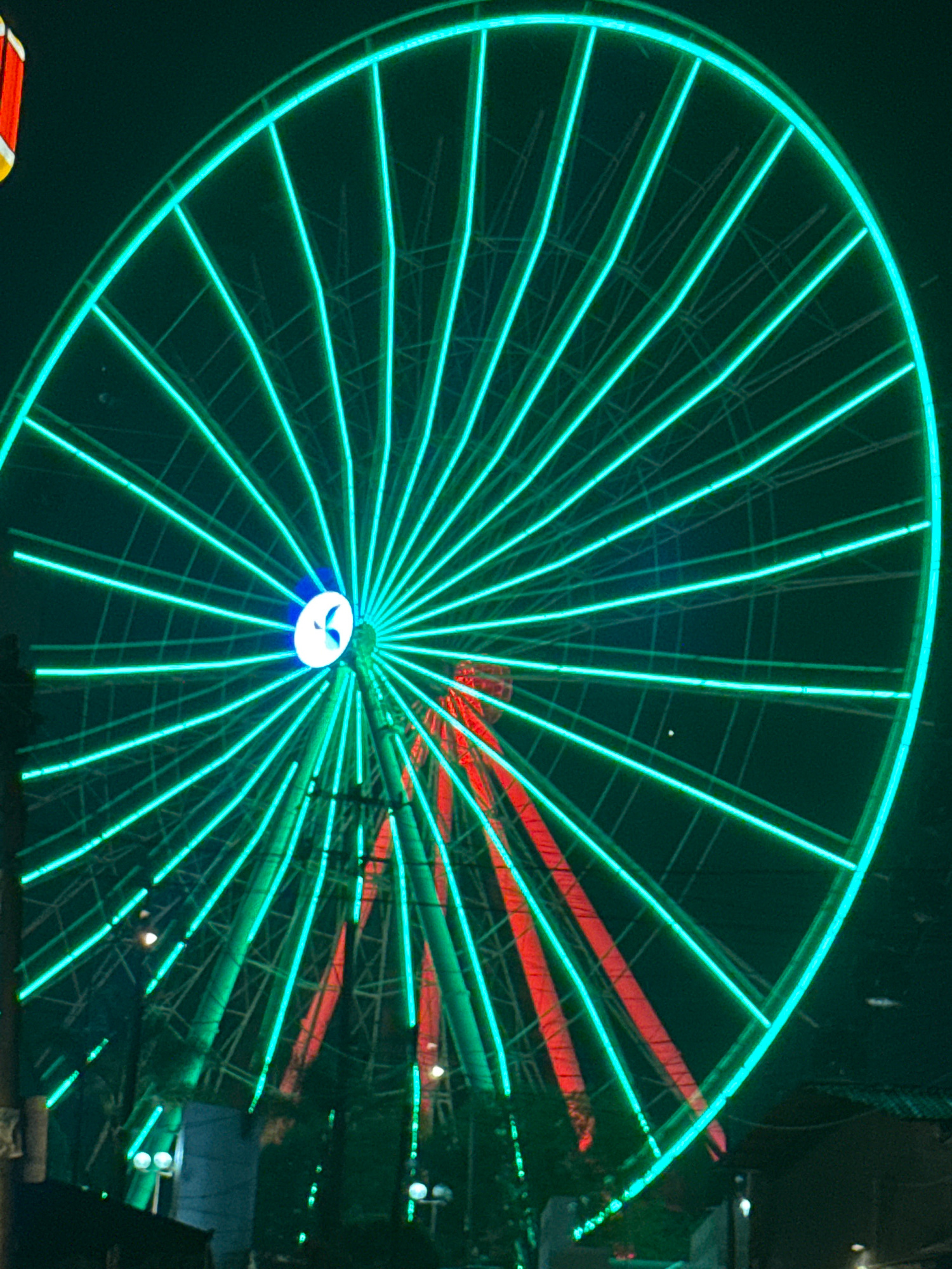 The image depicts a brightly lit Ferris wheel at night. The wheel is predominantly illuminated with a vibrant green light, outlining its circular structure and the radiating spokes. Some sections of t…read more