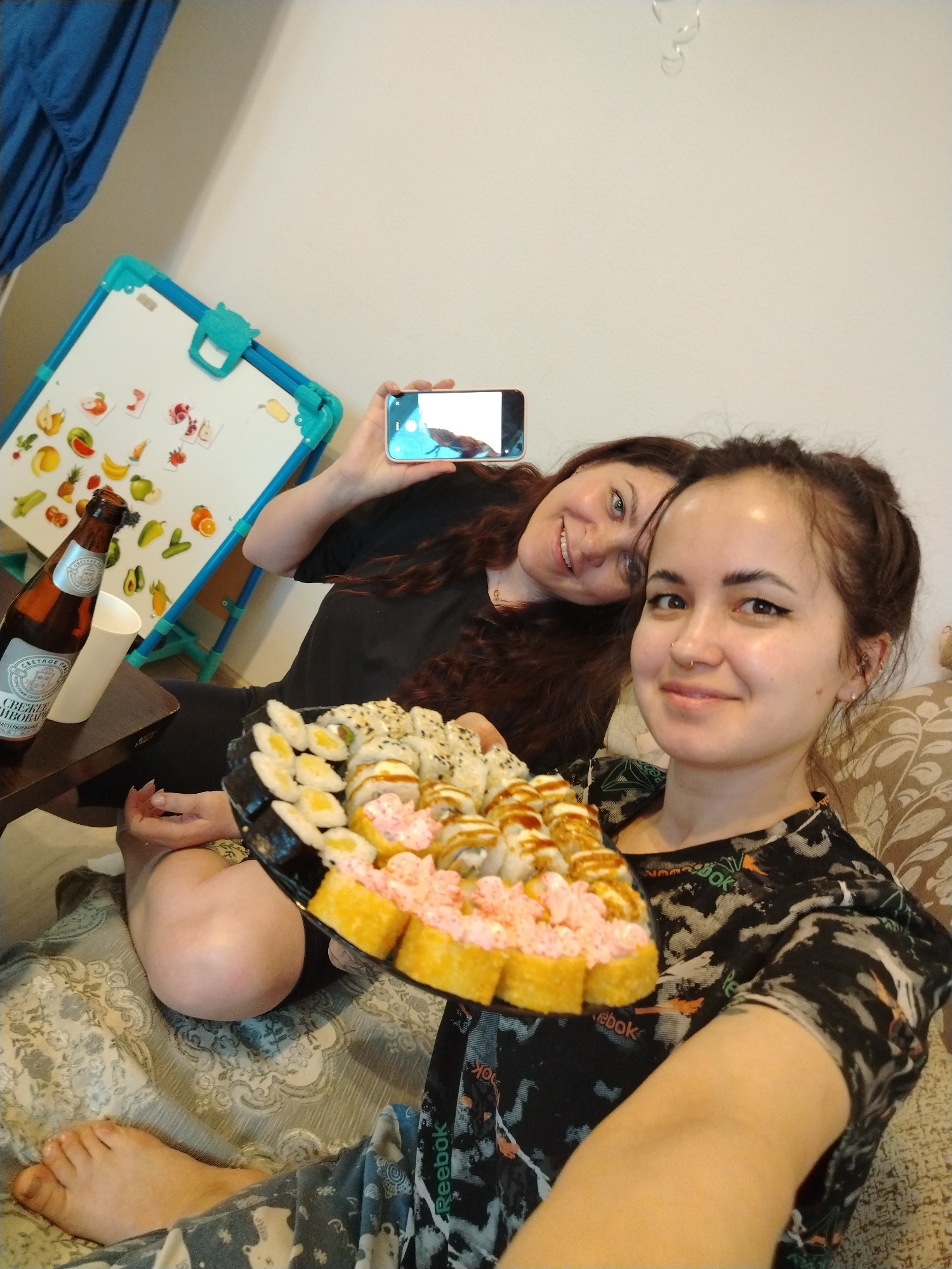 Two women are in an indoor setting, possibly a home, based on the presence of a couch, a small table, and a child's whiteboard with food magnets. The woman in the foreground is holding a large tray ofβ¦read more
