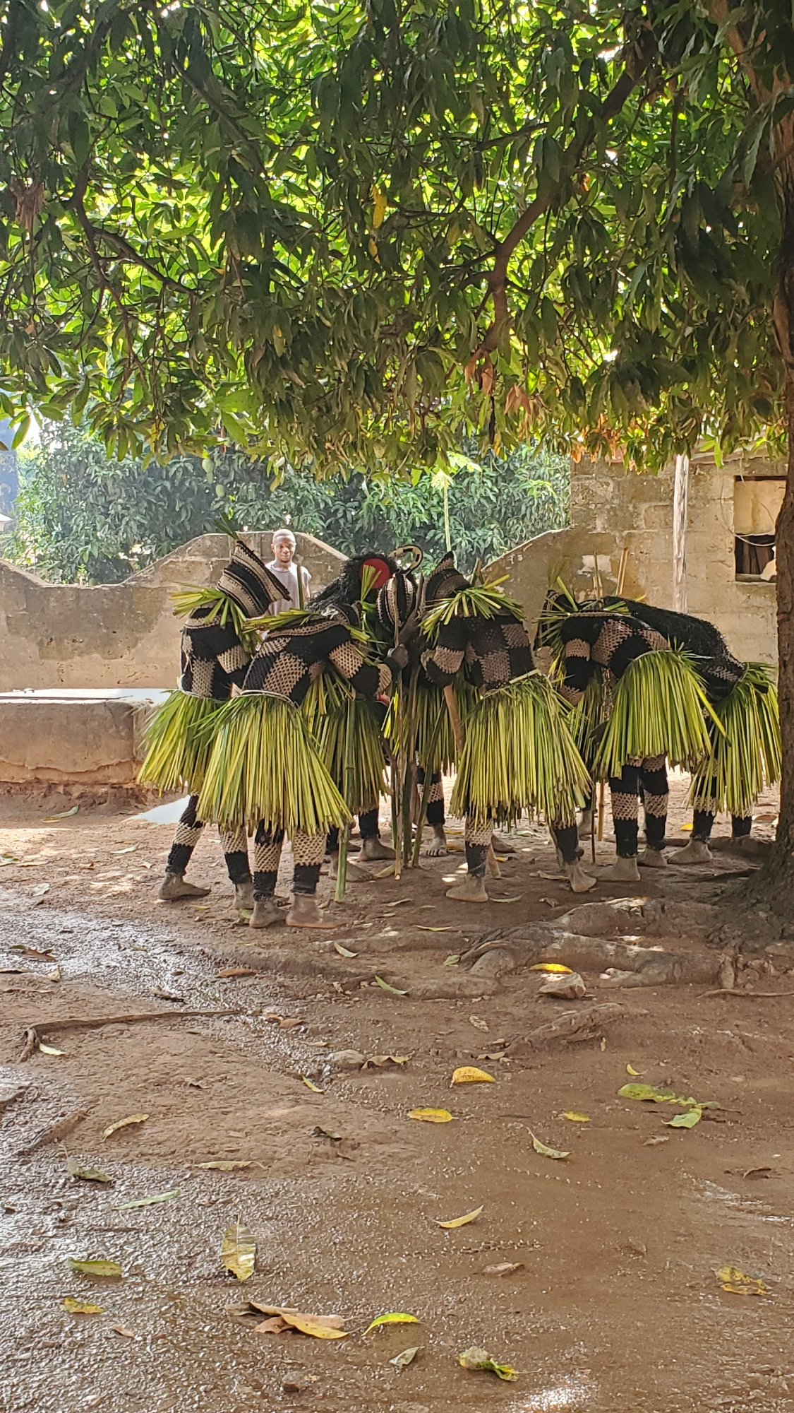 A photograph taken outdoors in Akwanga, Nigeria, shows five figures dressed in traditional costumes with black-and-white checkerboard patterns and green raffia skirts standing in a row. The figures ar…read more