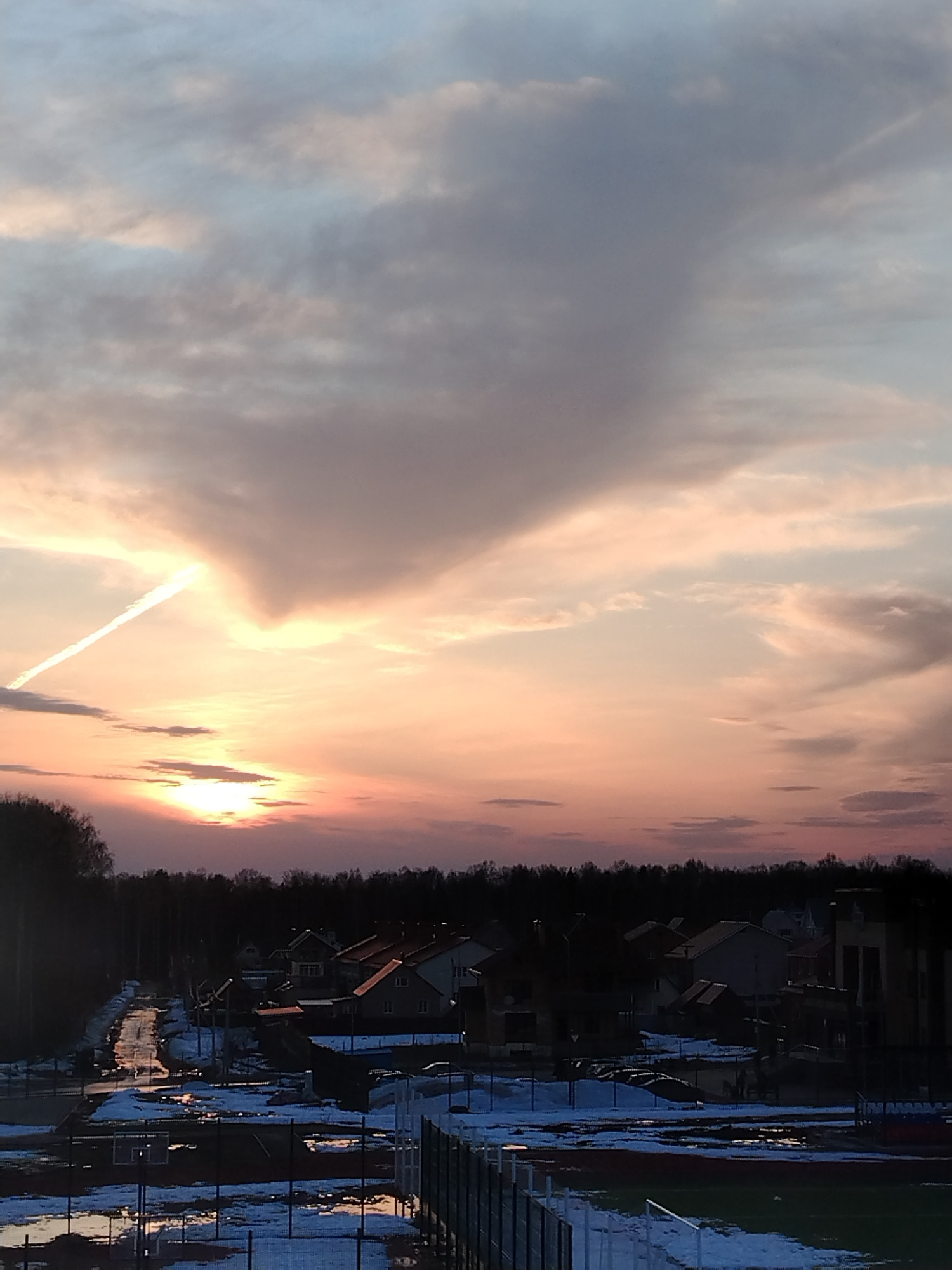 The image shows a sunset over a residential area in Noviy, Russia. The sky is filled with clouds tinged with orange and pink hues from the setting sun. A contrail is visible in the sky. Below, a row of houses is silhouetted against the horizon, with a dark line of trees in the background. In the foreground, a sports field with remnants of snow and puddles of water is visible. A fence borders the field. | Open Wire