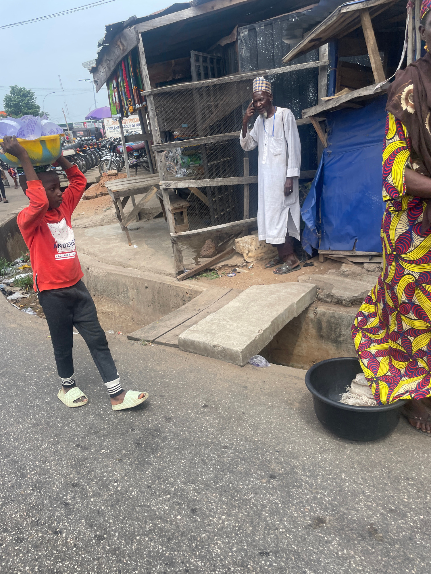 The image shows a street scene in Lokoja, Nigeria. A person in a red sweater and black pants is walking down the side of the road, carrying bags filled with yellow and blue items. An older man in a wh…read more