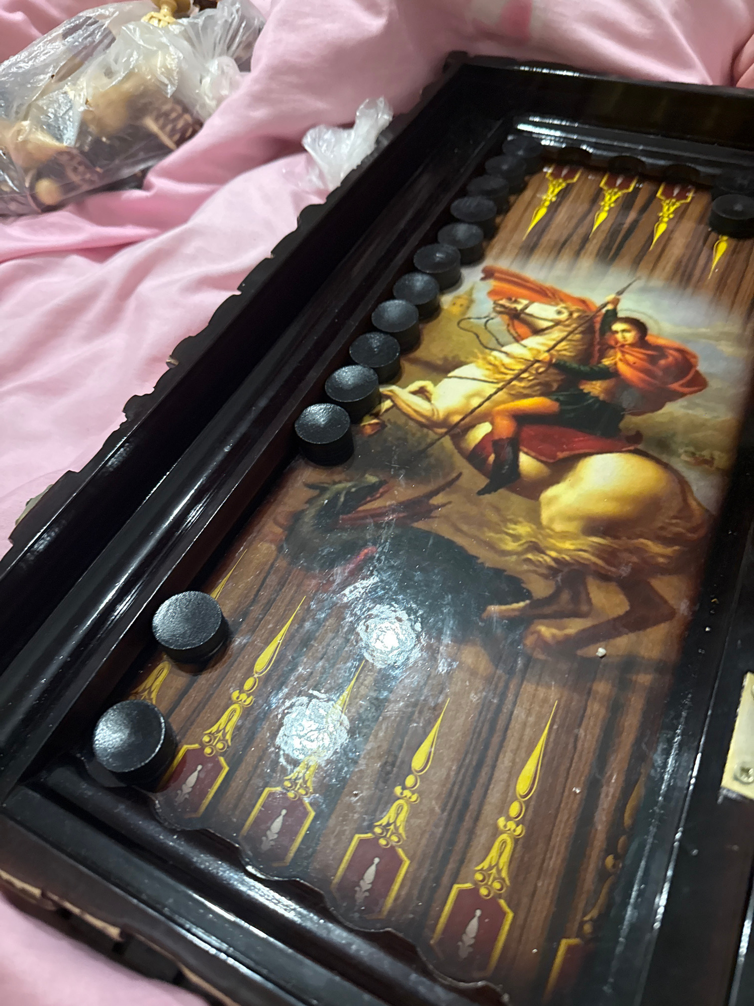 A close-up shot shows a partially opened backgammon board resting on a pink surface. The board is adorned with an image of a knight on horseback slaying a dragon. Black checkers are positioned along t…read more