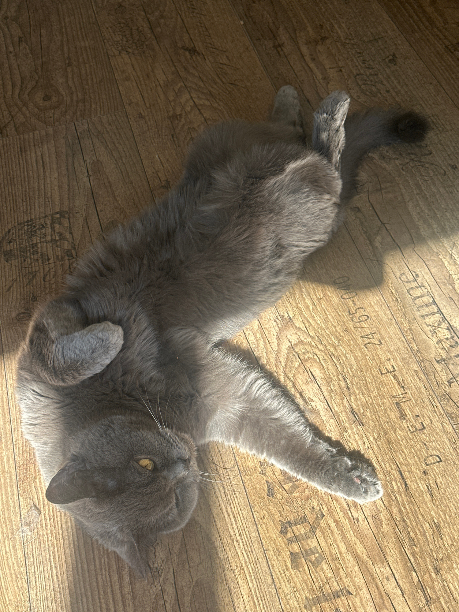 A gray cat lies on its back on a wooden floor with decorative lettering. The cat has its tail curled slightly upwards and its front paws are positioned in a relaxed, playful manner. One paw is extendeβ¦read more