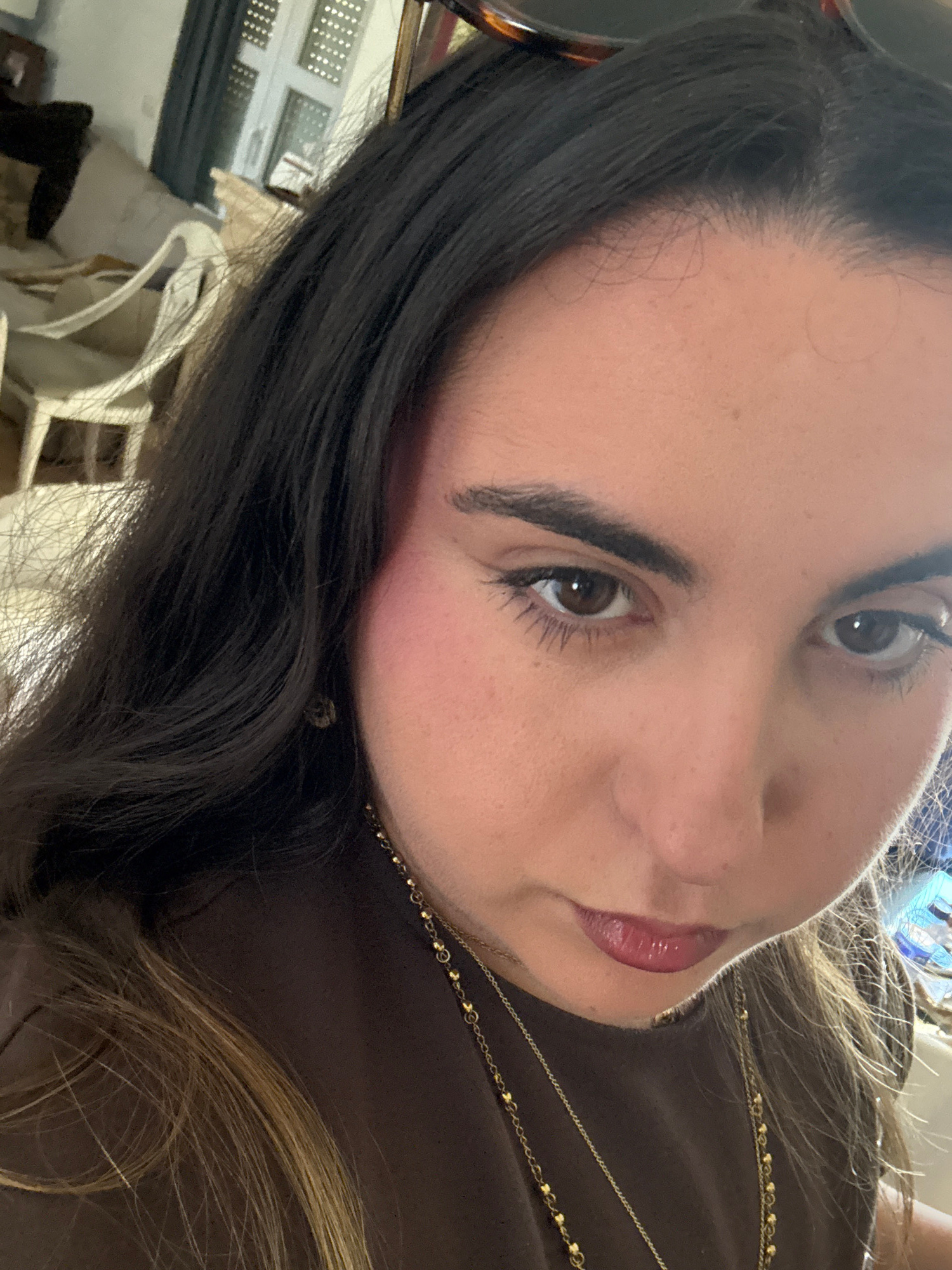 A selfie taken indoors. A woman with dark brown hair, brown eyes, and light skin is facing the camera. She wears a brown shirt and a gold necklace. In the background are chairs, blinds, and a white sh…read more
