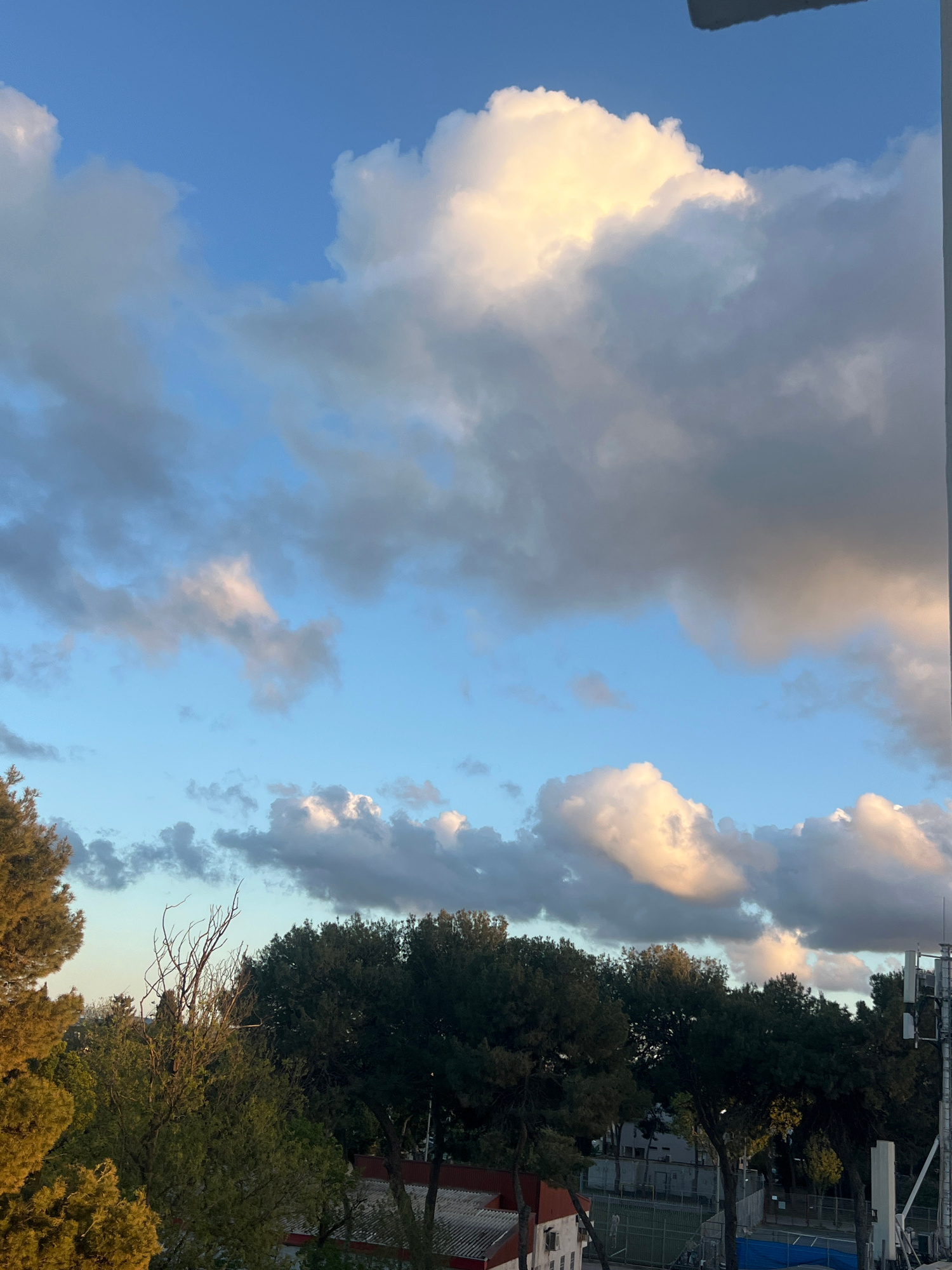 The image depicts a view of the sky over Kiryat Bialik, Israel. A large cumulus cloud is visible on the left side of the frame, contrasted against a blue sky. A line of trees defines the horizon on th…read more